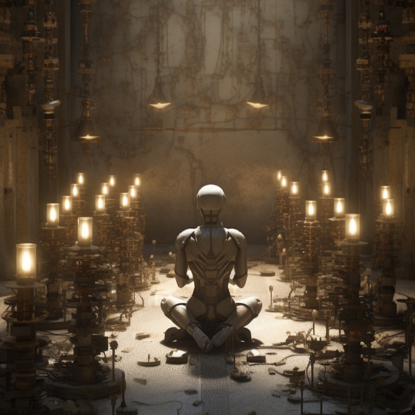 Cinematic industrial psybient meets ritual dub, Opens with deep drones, synthetic cave ambience, and corrupted machine pulses, Low ambient voices chant in a fictional tongue—emotionless, synthetic, and sacred, Ceremonial drums echo beneath glitched textures and alien harmonics, No melody, just brooding atmospheres and mechanical breathing from an AI long forgotten, A forgotten bunker where war-born gods sleep, Condensed Summary: