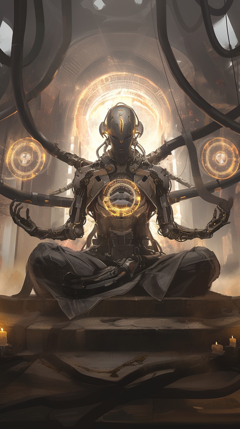 An androgynous synthetic voice recites ritualistic phrases, similar in rhythm to ceremonial chants, but not sung, No melody, The voice should whisper or speak slowly in a monotone, evoking the presence of a godless machine, Condensed Summary: