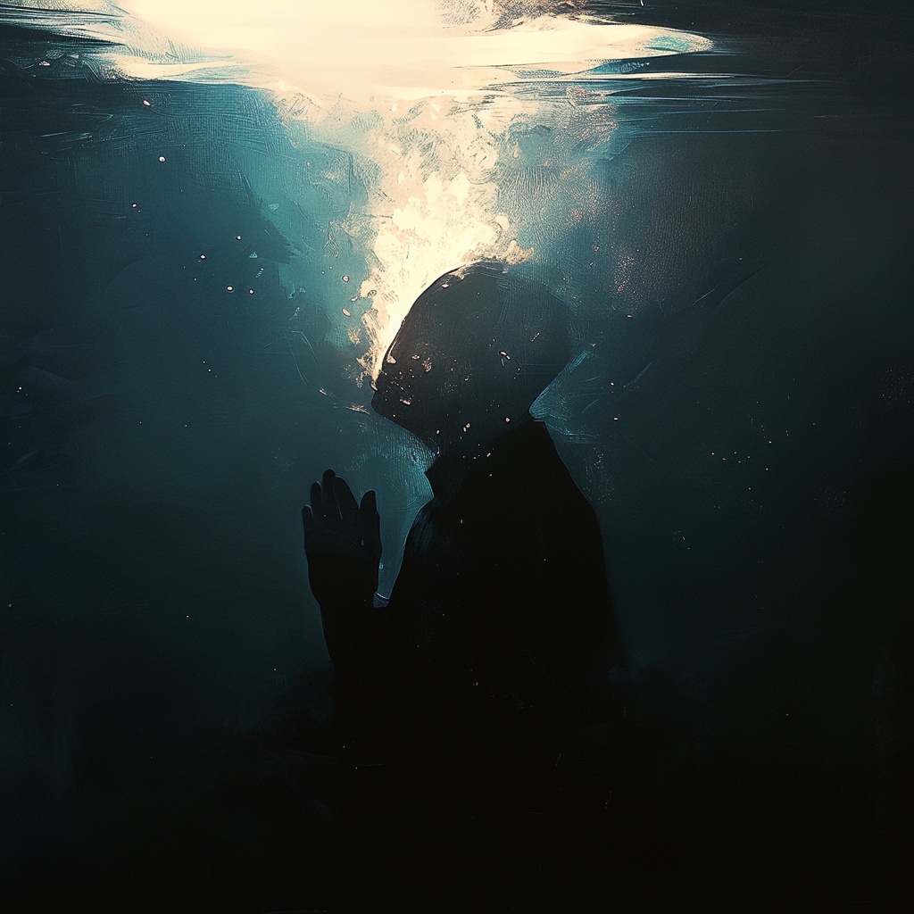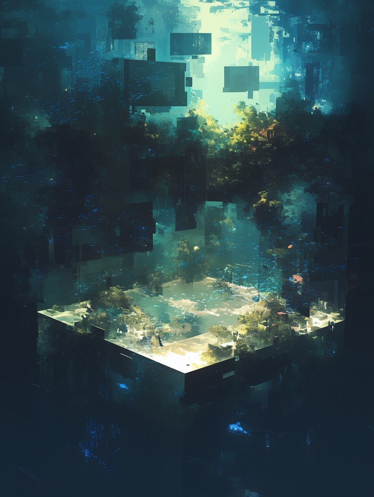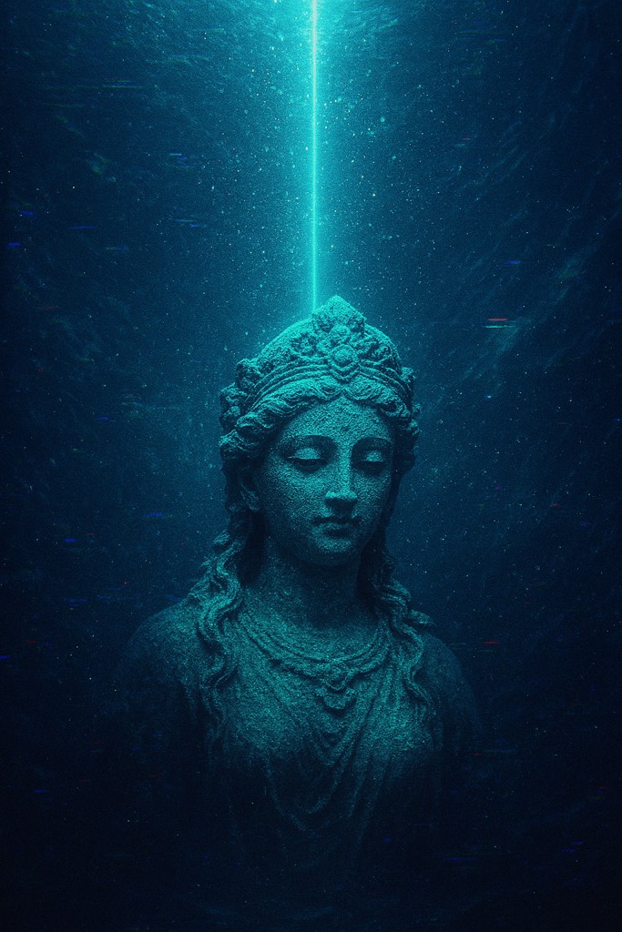A formless minimal ambient piece drifts with submerged psybient textures and deep reverb, Abstract glitch pulses weave between synthetic swells and subdued ambient noise, Ethereal layered voices, sung in fictional language with Bulgarian choir harmonies, float through the dense, dark, underwater atmosphere