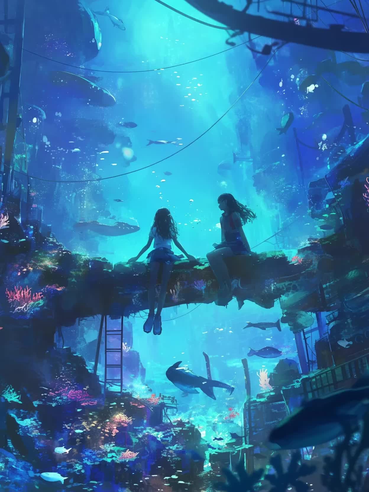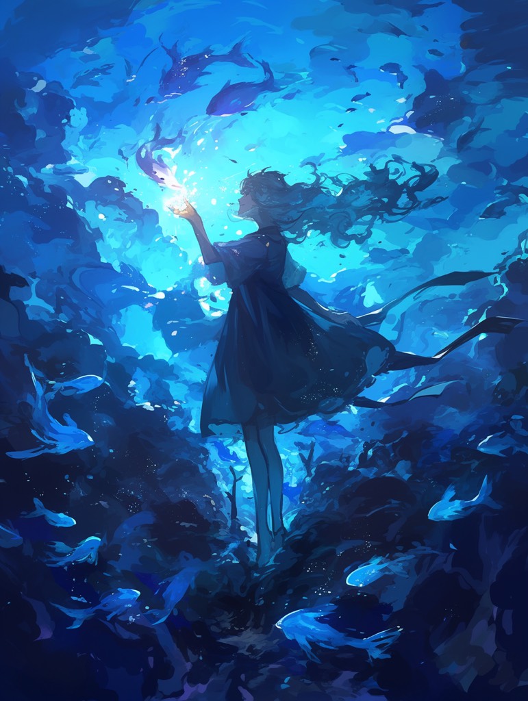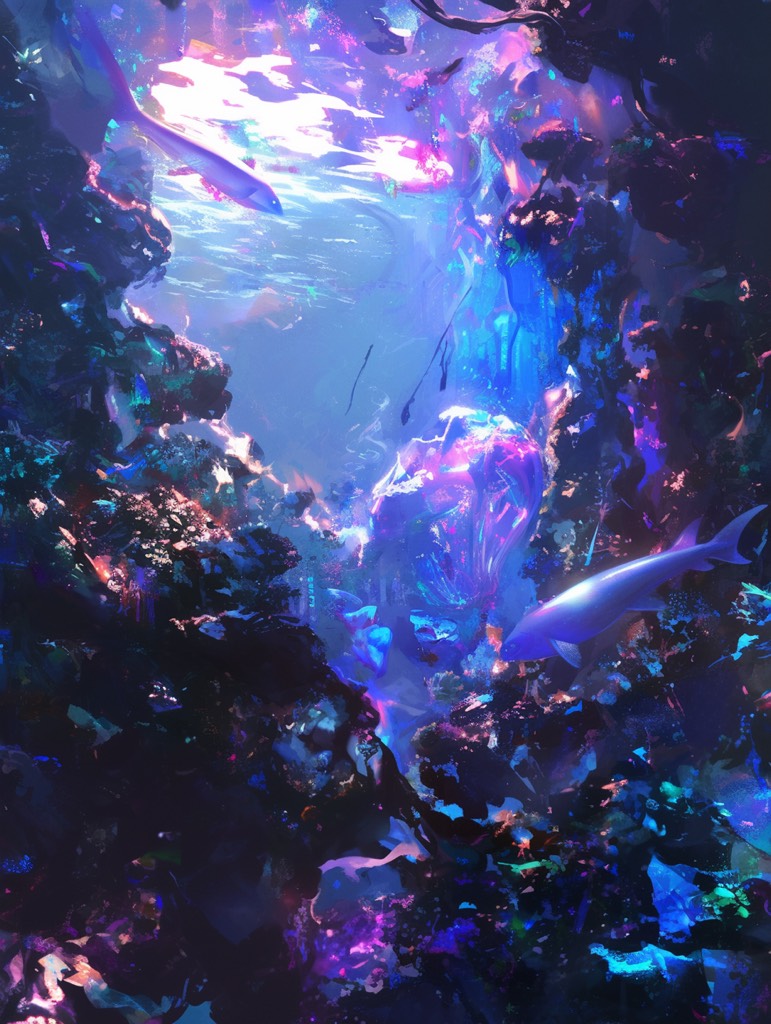 An experimental ambient track unfolds with dark, fluid synth layers, pulsing and shimmering like light through water, Deep bass textures underpin reverberant sound design—subtle aquatic noises, bubbles and ripples, Ethereal Bulgarian vocal harmonies drift in and out, processed with heavy delay and reverb, evoking a mysterious, aquatic world, Sparse, calming percussive textures surface at intervals, enhancing the atmospheric depth