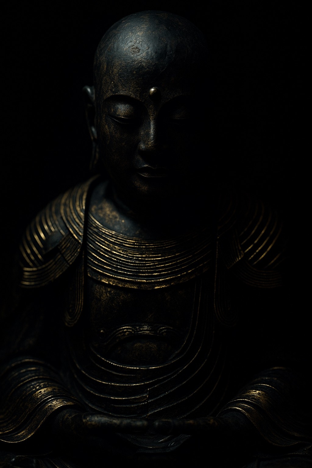 Dark ambient psybient with ritual drums, synthetic chants, and machine-driven atmospheres, Echoes of a forgotten war deity, asleep within AI ruins