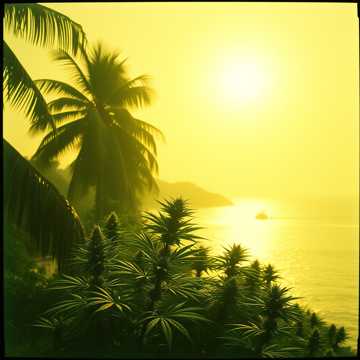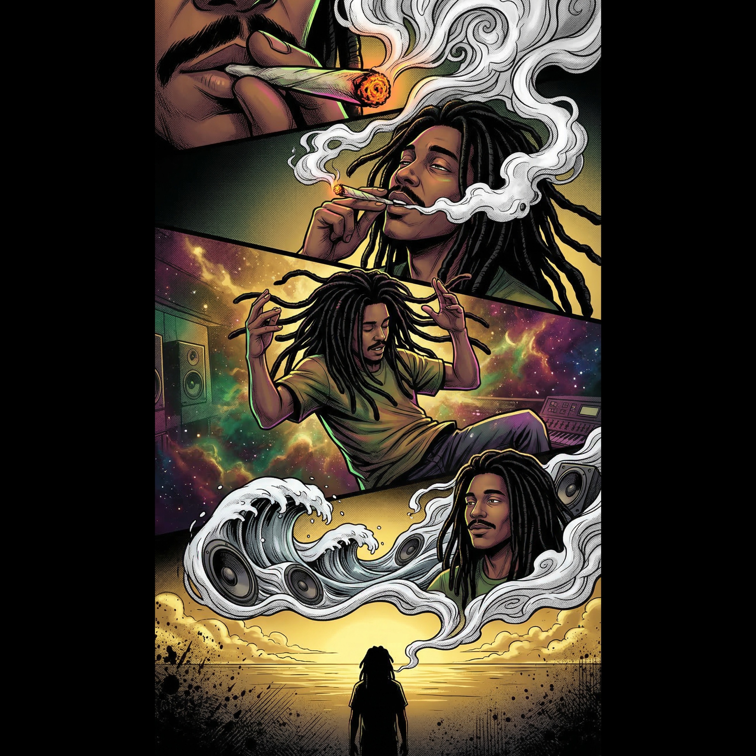 Energetic reggae–rock fusion with ragga vocals, brass, and tropical percussion, Bright whistle hook intro, steady driving rhythm, and two guitar solos: a short melodic riff before verse two and a long expressive solo near the end with wah and echo effects, Feels like flying down a cosmic tropical highway — love, ganja, surf, and freedom under the stars, Positive energy, island groove, and spiritual uplift