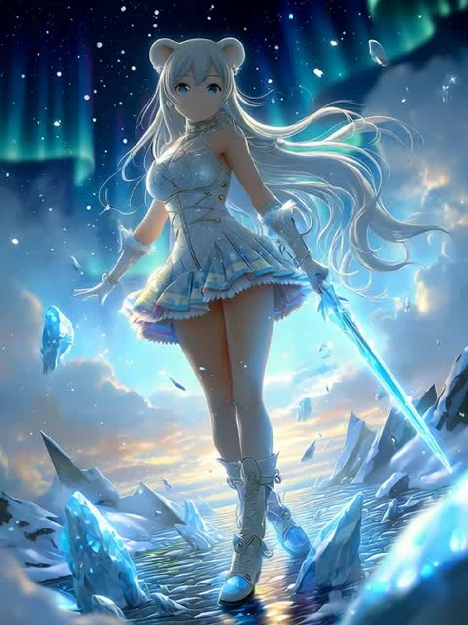 Begin with shimmering glockenspiel and bell-like synth tones sparkling like drifting ice particles, layered with soft ethereal female humming and low orchestral strings, then introduce clean electric guitar arpeggios drenched in expansive reverb alongside glassy, crystalline percussion that resonates like frozen pillars, gradually joined by a tight, all-female band rhythm section featuring firm yet expressive drums and warm melodic bass that steadily intensifies the pulse, while sweeping orchestral strings and bold brass build a sense of fateful grandeur, leading into a powerful anthem-like chorus centered on soaring female lead vocals supported by mixed choir, luminous keyboard textures, wide string harmonies, noble French horns, and transparent, distortion-free guitars that emphasize clarity over aggression, creating a dramatic call-and-response between lead and choir to portray the collision and resonance of light and darkness; in the middle section, let electric guitar and solo vio
