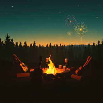 Environment: campfire crackling, pouring drinks, sizzling food, fireworks, group laughter and chatter, soft breeze, distant owl hoot; stereo spread for immersive 3D space