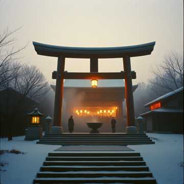 Soft winter wind, Subtle shrine ambience, Very gentle bell resonance, Distant crowd presence kept minimal, No dramatic effects, Structure: