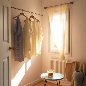 Soft morning ambient sounds, subtle wind through window, clothes swaying, gentle room noise, Spoken Japanese only, whisper-like, soft, gentle, natural breathing, do NOT sing, do NOT hum, do NOT vocalize melody, Realistic timing, human-scale pauses, Listener feels "actually hanging laundry in the morning" with presence and subtle environmental cues