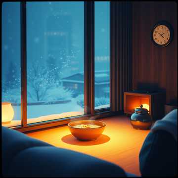 Instruments/Sounds: soft home ambience, distant TV, clock ticking, winter night air, subtle plate/tea sounds