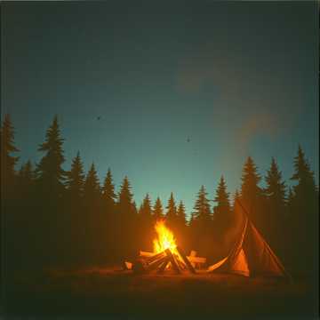 Mood: Cozy night camp, quiet warmth, peaceful presence