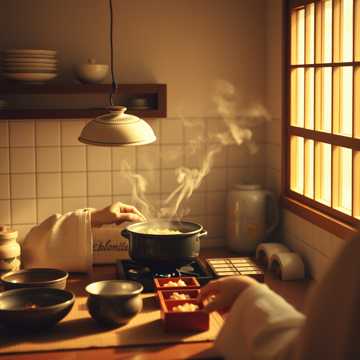 quiet Japanese home on New Yearโs Day, kitchen ambience, ceramic bowls, chopsticks, steam, pot lid opening, subtle movements, footsteps, Very minimal background sound, No emotional emphasis, No performance feeling, The listener feels like visiting a quiet neighborโs house, welcomed briefly, without obligation, Comfortable, warm, and peaceful