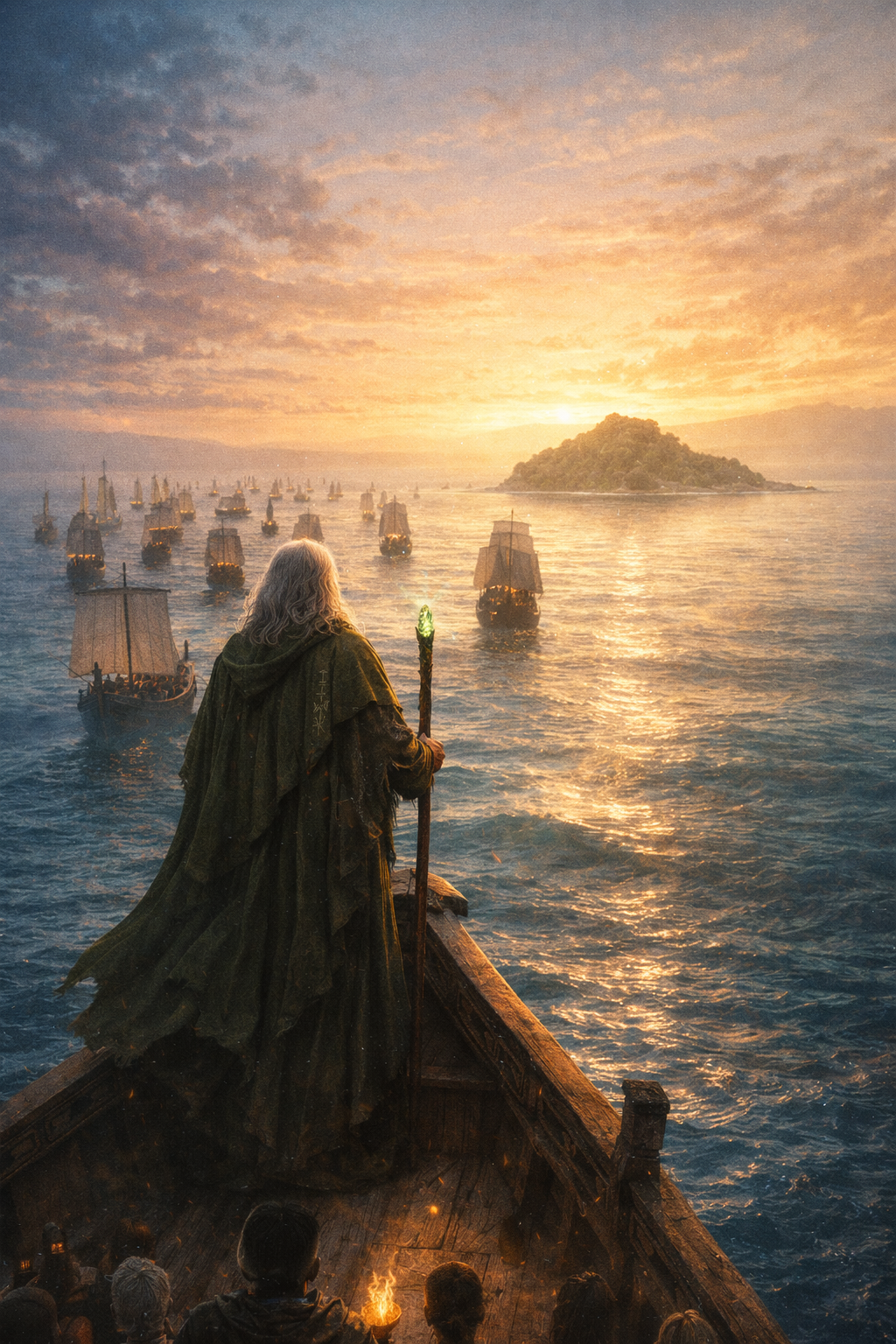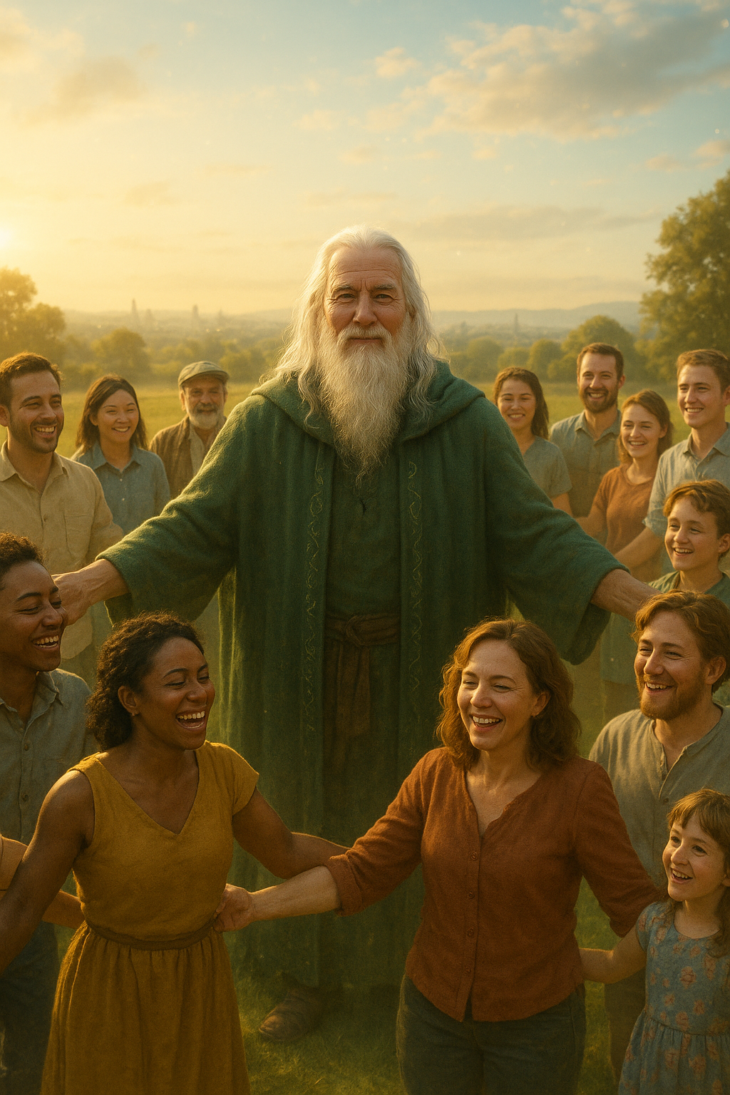 Epic German rock-reggae-ska fusion hymn by Myrddin’s Armee, Genre blend of electric guitars, brass ska riffs, reggae groove, rap bridge, and epic choral finale, Tempo ~100 BPM, Mood: uplifting, mystical, uniting, heroic, Lead: deep confident male vocal, warm tone, half-spoken intro, strong melodic choruses, Backing: female choir + crowd chants “Oh-oh-oh” for unity, Builds from calm reggae verse to powerful rock-ska anthem, Key instruments: drums, bass, electric guitars, brass, organ, percussion, Dynamic rise, layered harmonies, cinematic energy, Theme: community, compassion, strength together, Final chorus feels like thousands singing in one voice, End with echoing whisper: “Tritt ein… vergrößer den Kreis… wir sind vereint, ”