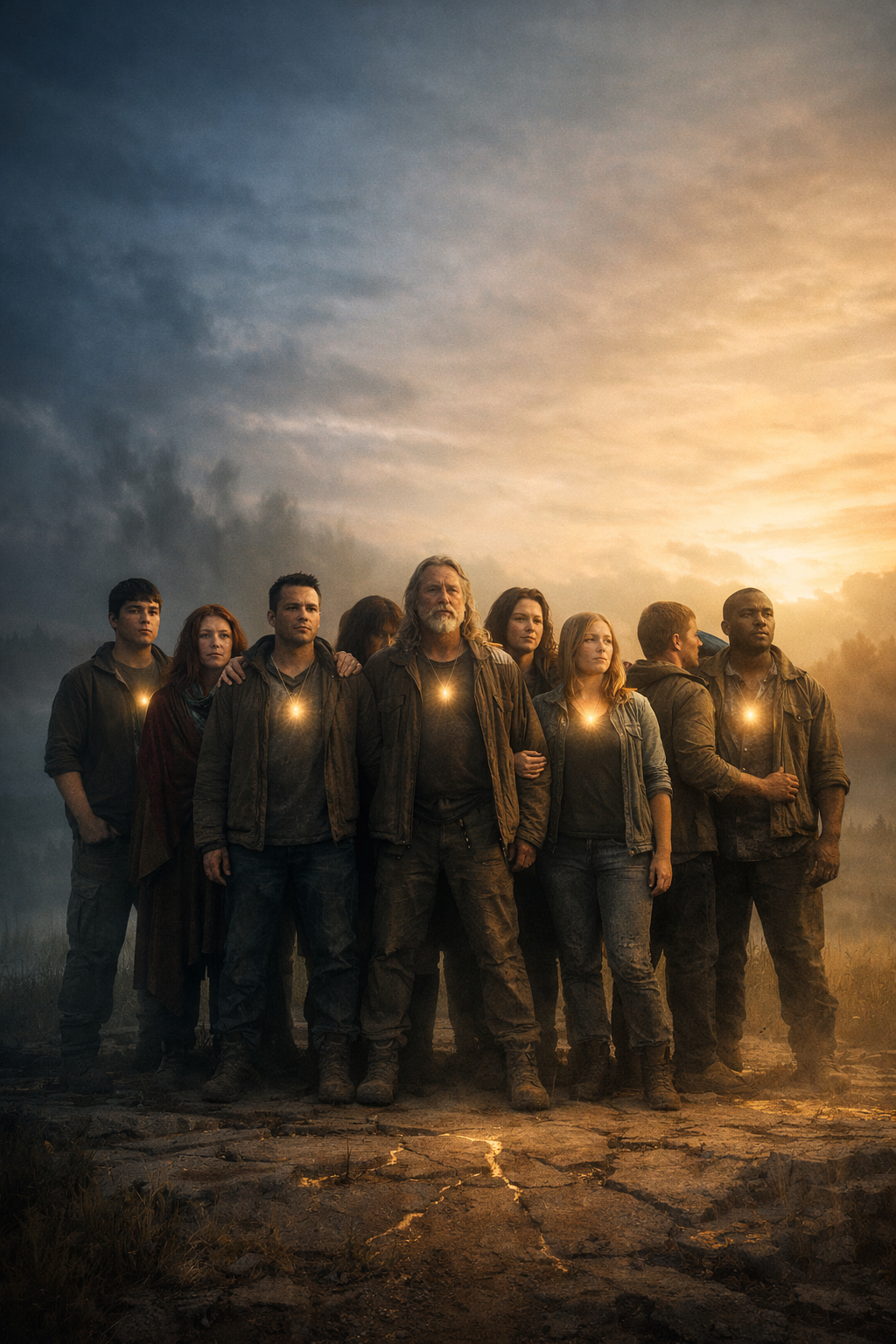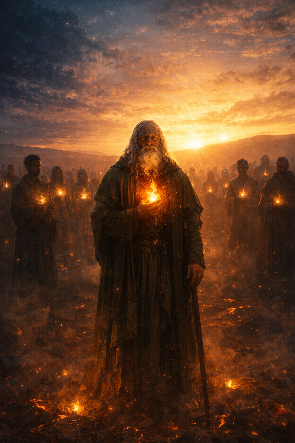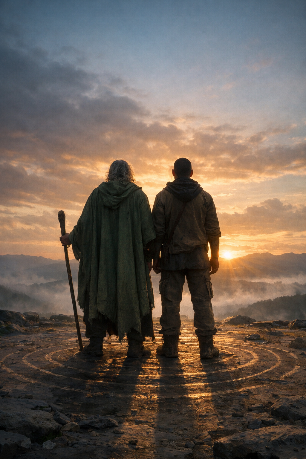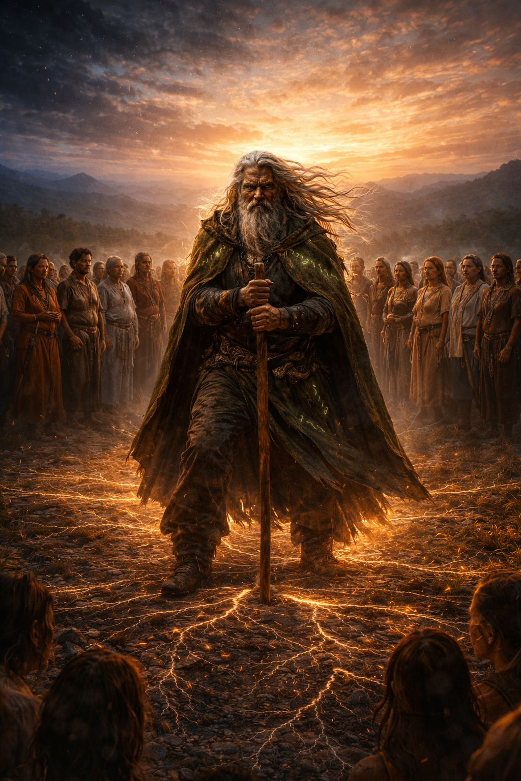 Epic ritual reggae-rock-ska fusion built on an ancient cyclic pulse, Mid-tempo heartbeat rhythm with deep tribal drums, warm offbeat guitars, rolling bass, and subtle ska brass stabs used sparingly for lift, not cheer, Cinematic atmosphere, minor-to-major movement symbolizing return and renewal, Vocals in German: strong, clear lead voice with calm authority, supported by a mixed choir (men, women, children) singing simple, timeless call-and-response hooks designed for generations, Melodies are hypnotic, circular, and memorable, avoiding pop clichés, Production feels organic and monumental: wood, skin, breath, fire, crowd voices, Emotion: awakening, continuity, quiet power, ancestral memory, This is not a cover, but a reborn ritual song meant to be sung forever around fires, in streets, and in halls of stone