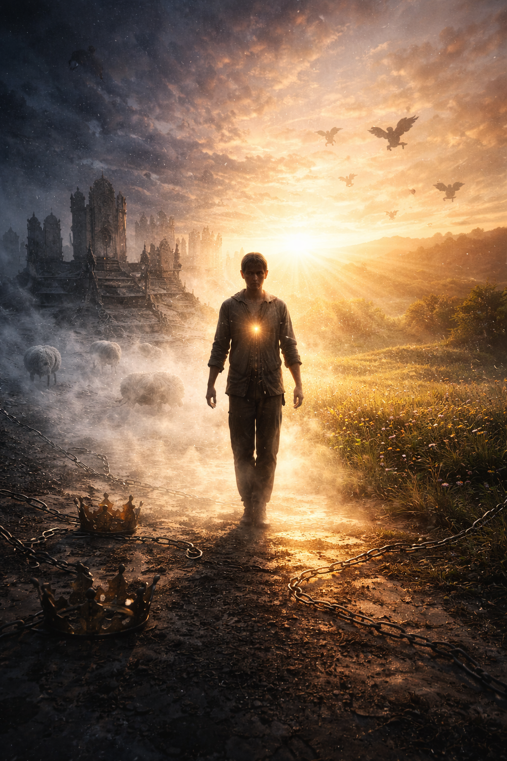 A cinematic mystical fusion of reggae, folk-rock, metal, and ethereal choral elements, Tempo around 100–115 BPM, key E minor, warm and uplifting, Gentle reggae offbeat guitars blend with atmospheric pads, glowing flutes, and soft celestial choirs, Verses are tender and mystical, sung with a warm emotional male voice; pre-chorus builds with rising strings and pulse-like drums, Chorus opens into a huge luminous anthem with layered harmonies, distant children-like voices, and shimmering reverb, Subtle tribal percussion and low heartbeat drums support the spiritual tone, Bridge becomes whispery, cosmic, mantra-like with breathy vocals and light ambient textures, Production is wide, dreamy, and bright: soft delays, airy reverb, glowing stereo spread, Mood: comforting, awakening, transcendent — stepping into a sacred realm of hope and inner light, hardcore powerful epic