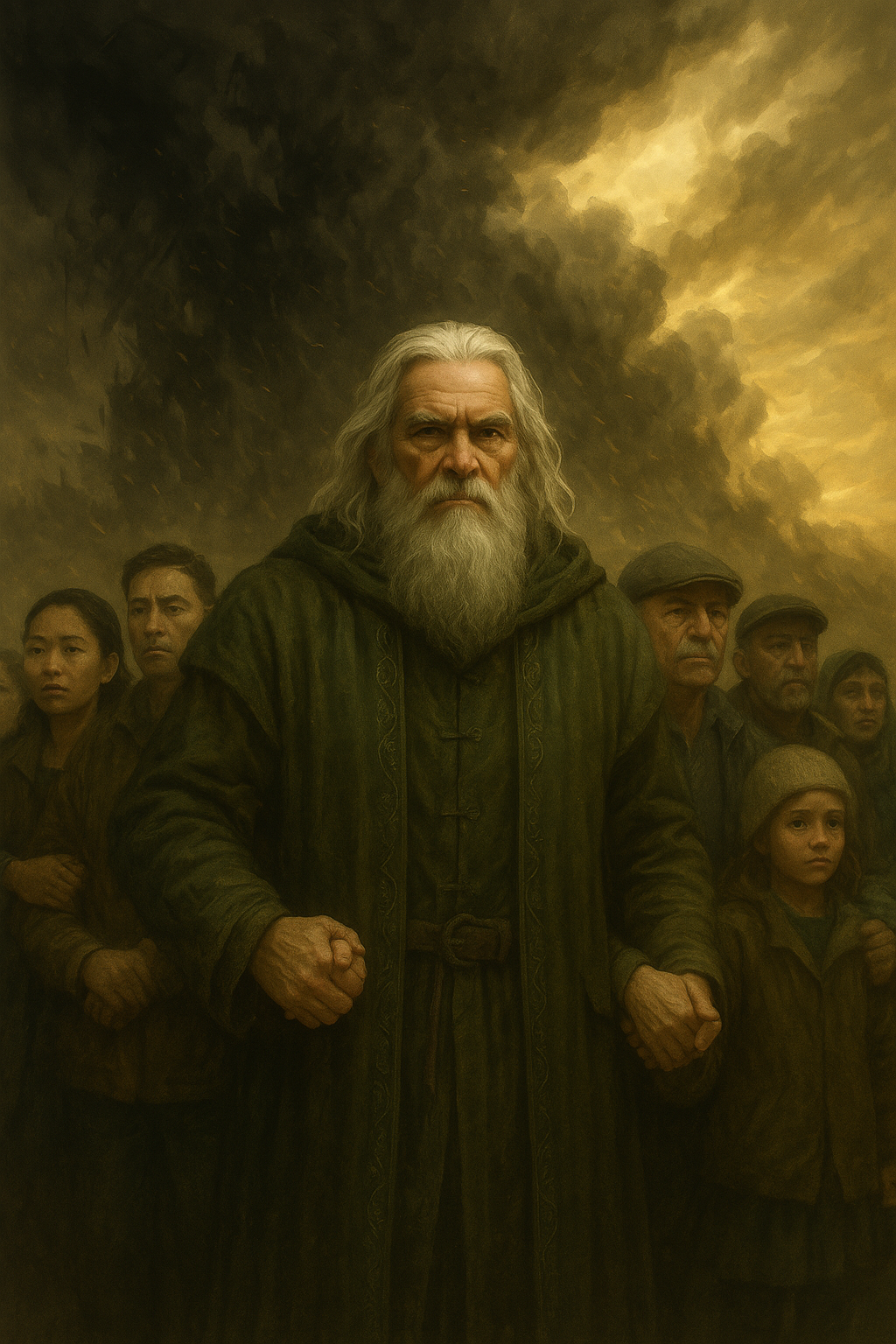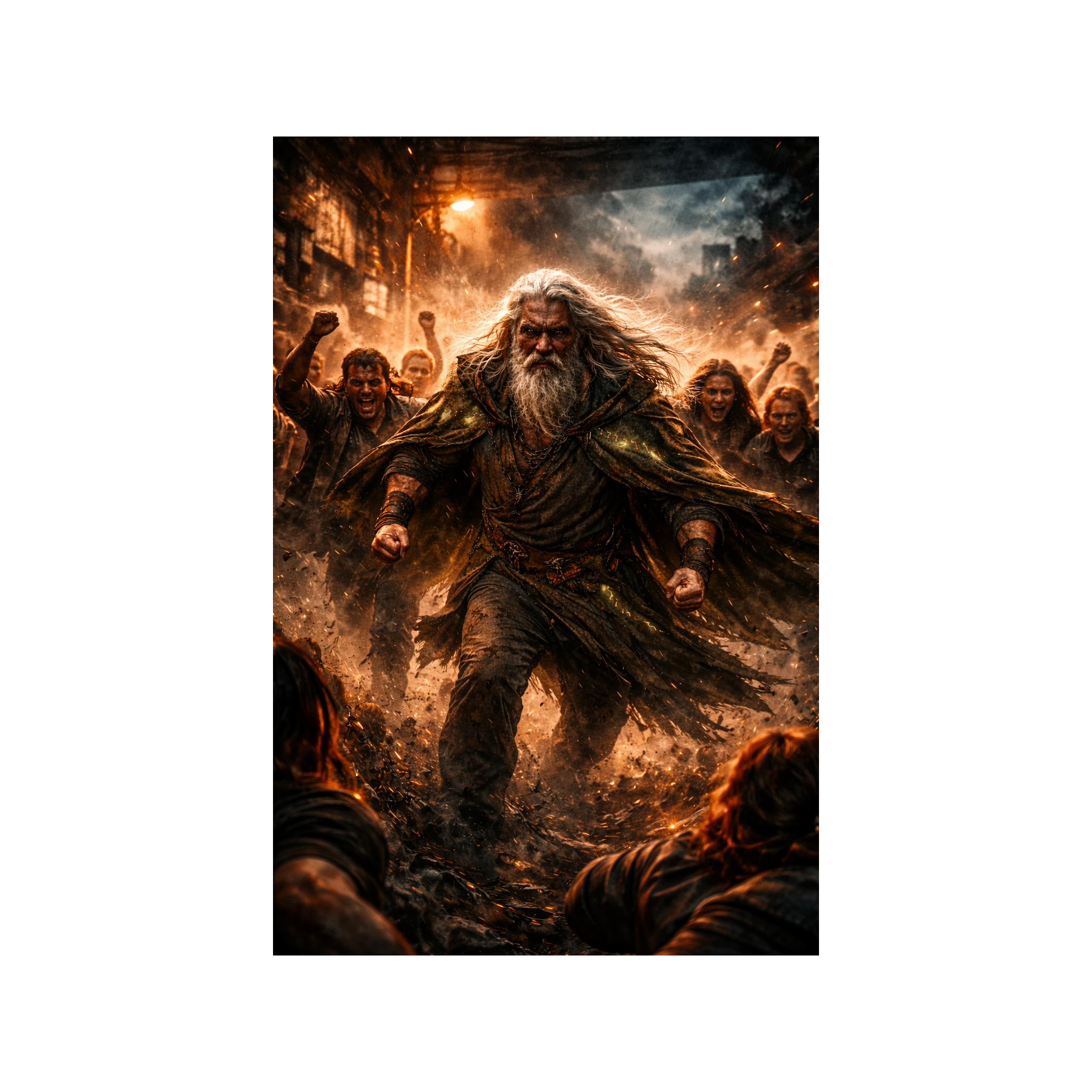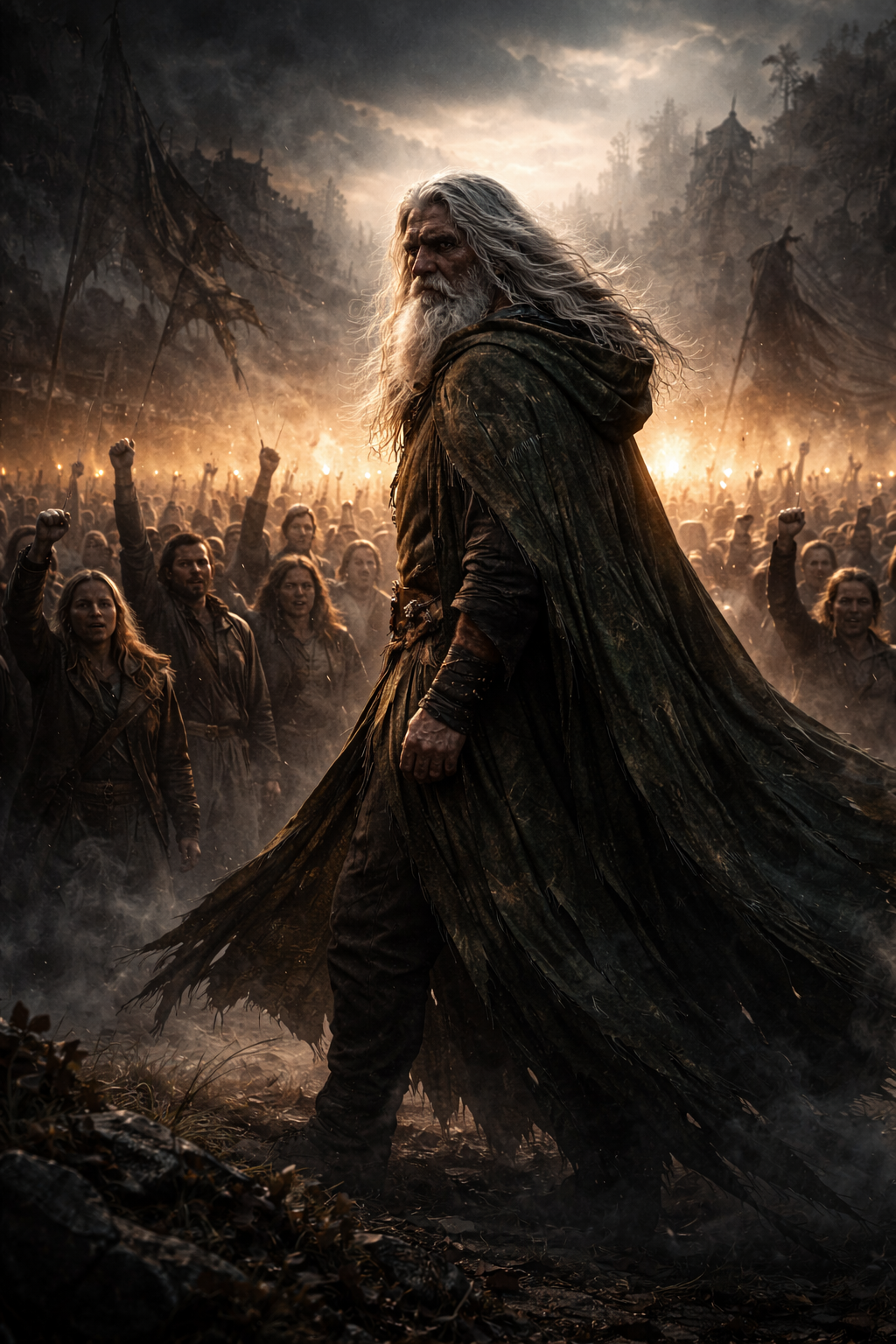A three-persona song fusion: Myrddin’s Armee delivers a German epic rock–reggae–rap–ska core with awakening energy, minor-key electric guitars, deep bass, and drums shifting between tense reggae pulse and driving rock force; sparse ska accents, precise narrative rap, and massive hymn-like choruses with gritty baritone gang vocals, cinematic strings, raw punchy production focused on truth and unity, Little Riddim Crew adds raw campfire rebel folk energy with acoustic guitars, warm rough vocals, unison choir, stomps, claps, whistling, call-and-response, natural outdoor reverb, simple powerful harmonies, rebellious yet hopeful mood, building from intimate moments into loud communal finales, Razor Wynn cuts through with cold, surgical English battle-rap: close-mic, restrained, interrogative delivery, minimal dark beats, ominous bass, sparse drums, sharp timing, lethal pauses, sudden rapid bursts, psychologically dominant, hostile and uncompromising, uplifting fusion epic powerful energetic