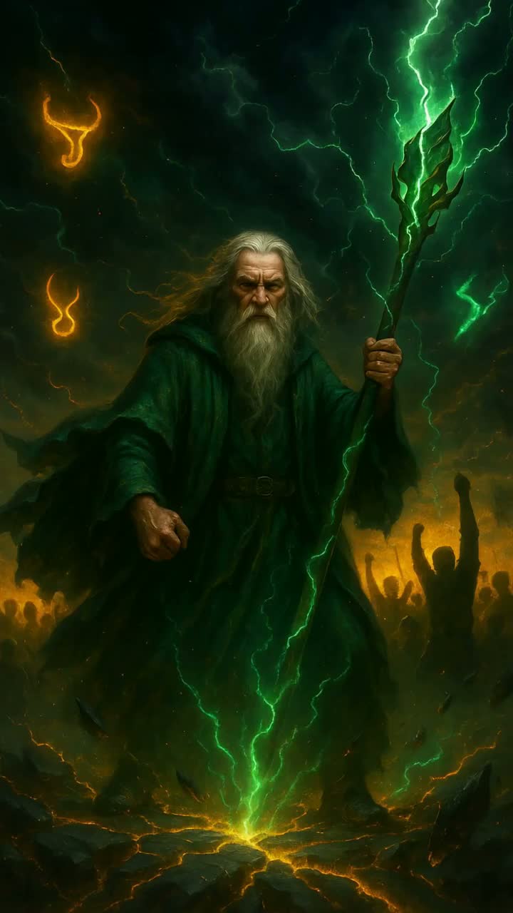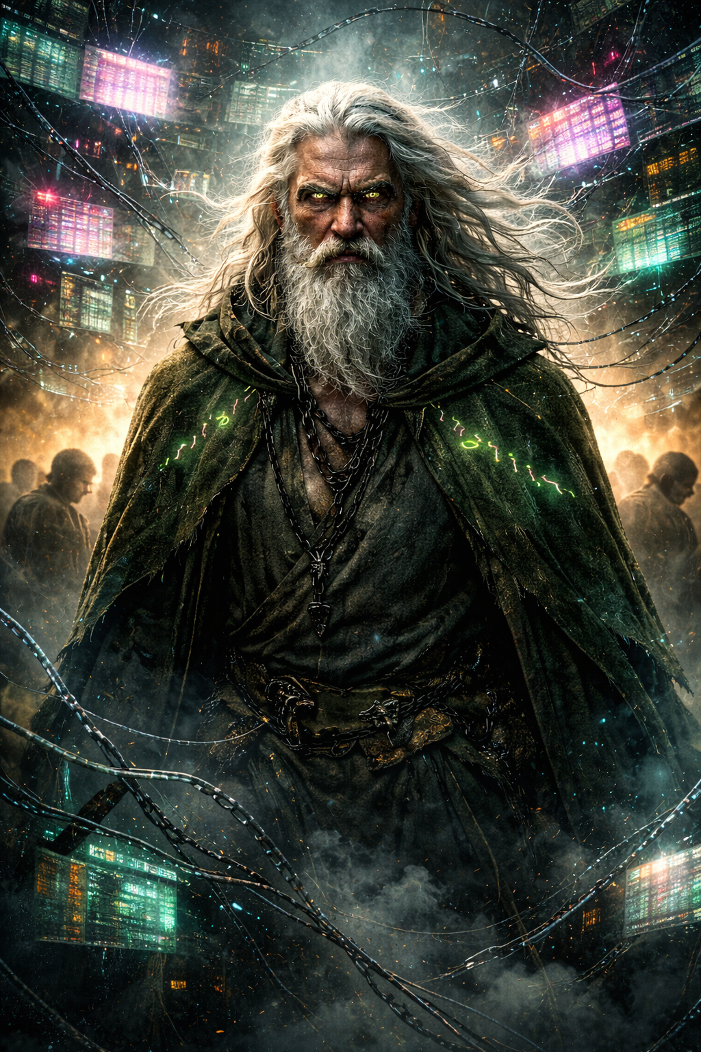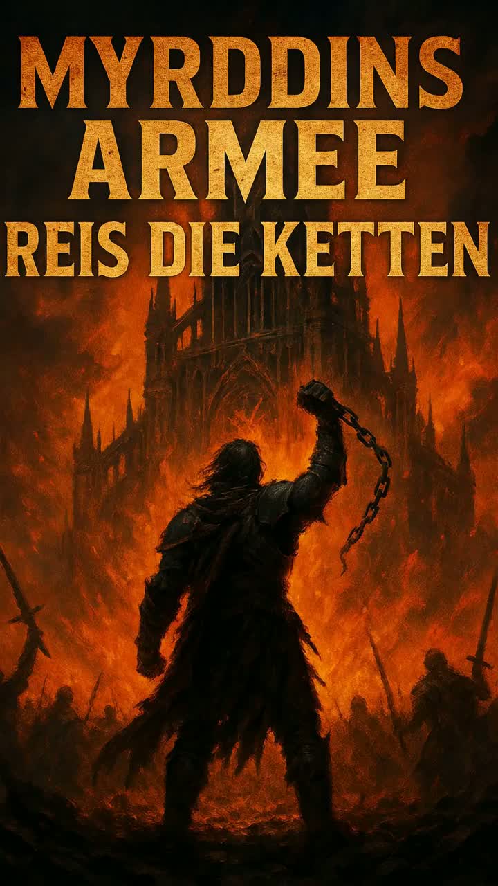 Myrddin’s Army Dark Sacred Rock–Metal–Rap–Reggae–Ska Fusion Style, Dark cinematic ritual in E minor, 110 BPM, Massive heartbeat drums like divine judgment, heavy low-tuned guitars, rumbling sub-bass, ominous choirs, Intro: whispered sacred questions, deep reverb, tribal toms, bells of fate, Verses: gritty rap + dark rock vocals over distorted bass pulses, metallic percussion, shadow-reggae offbeats creating a hypnotic sway, Pre-Chorus builds with tense strings, marching snares, rising brass — echoing “Kein König, kein Richter, kein Staat, kein Thron, ”