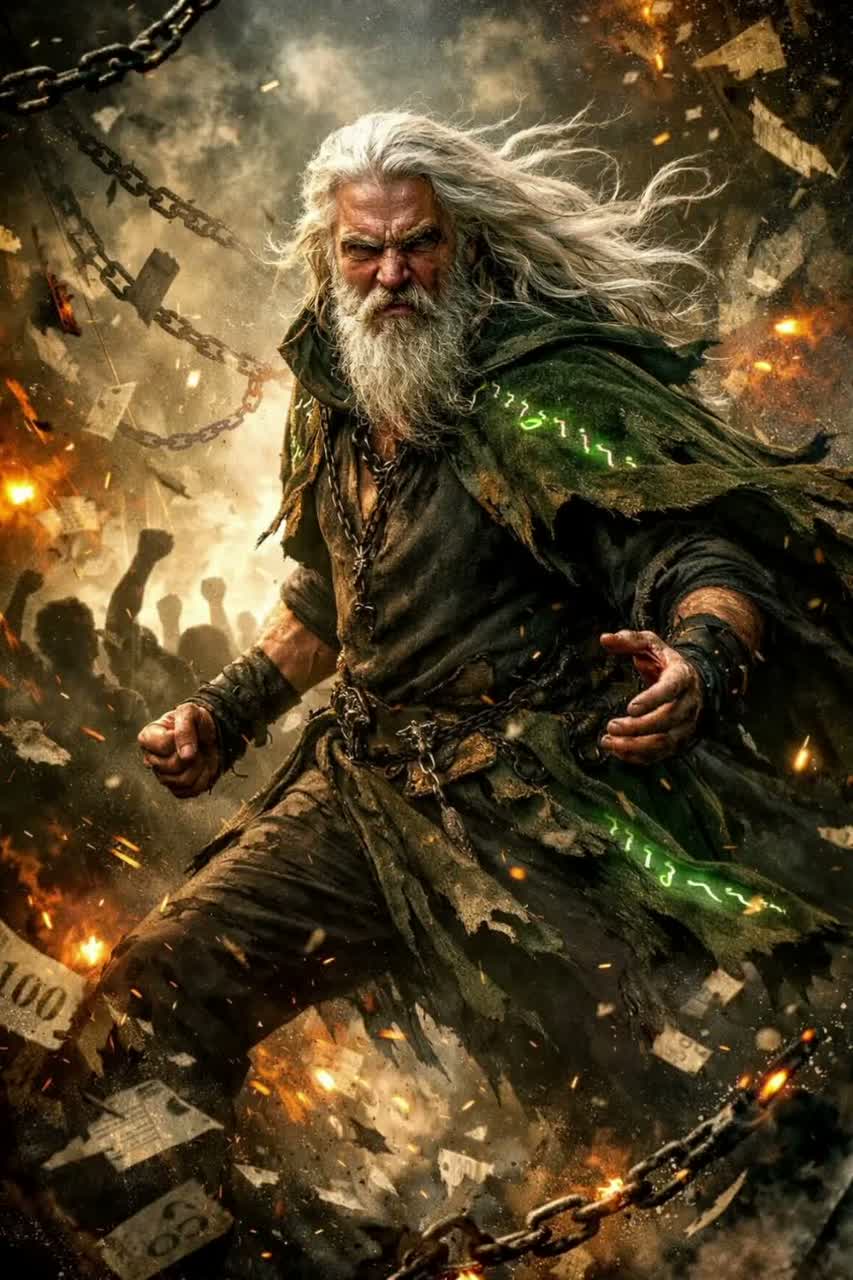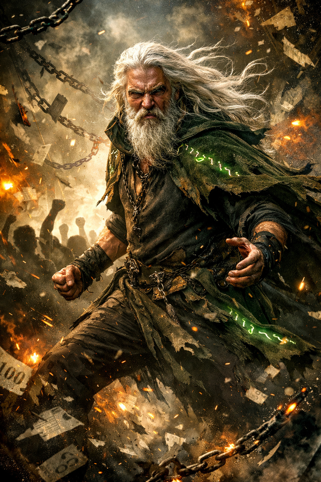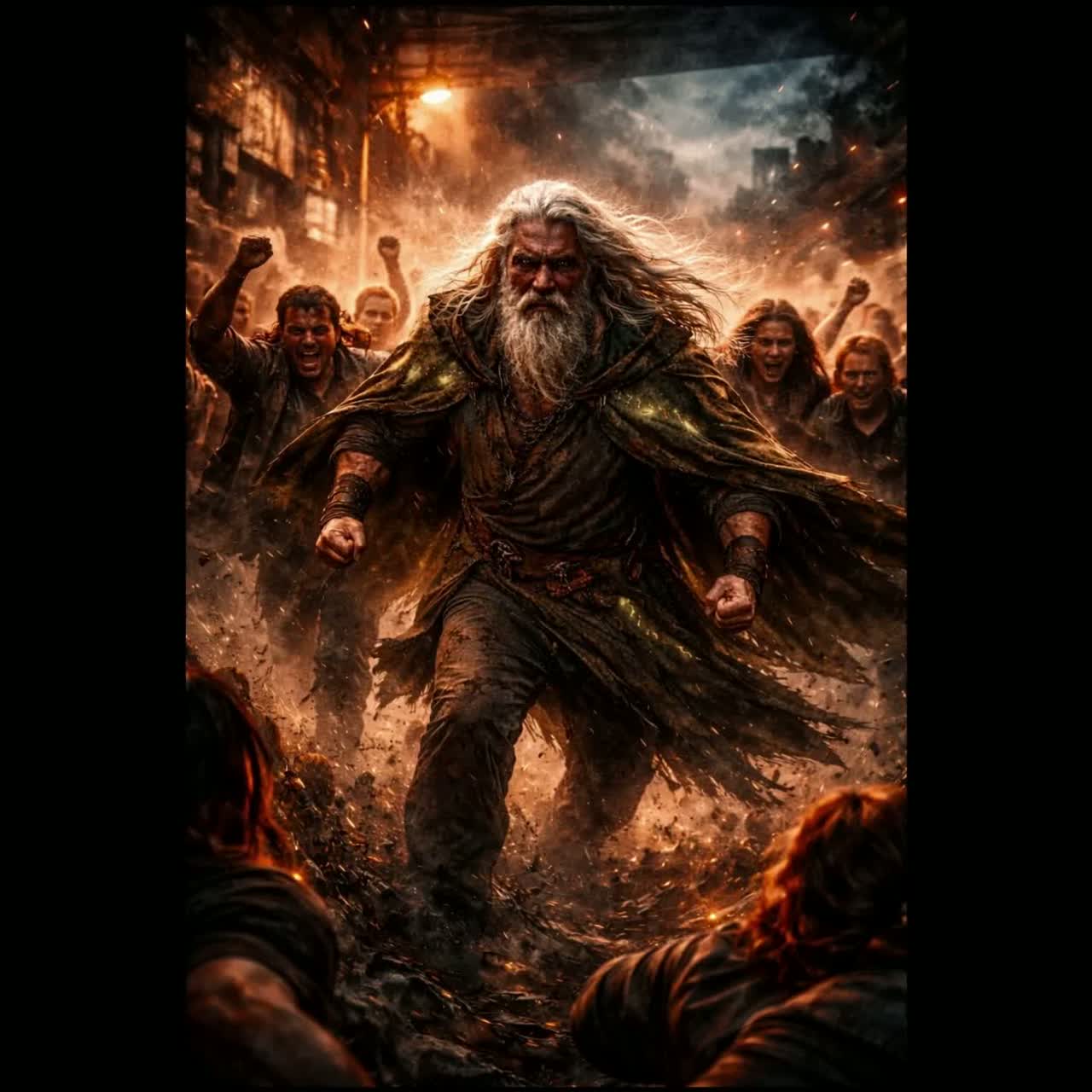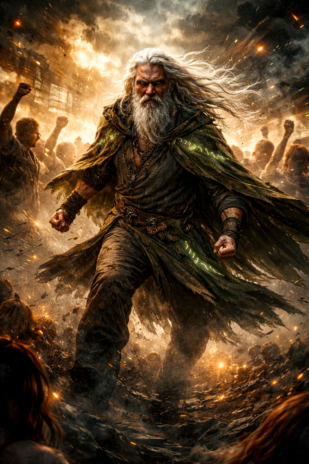 Devastating magical fusion in E minor, 112–128 BPM, Explosive metal guitars detonate with chugging low-end riffs, screaming harmonics, and earth-shaking distortion, Bass hits like seismic blasts — sub-heavy, crushing, pulsating with rebellion, Hardcore rock drums unleash double-kick storms, crash waves, and battlefield tom-rolls, Rap verses delivered with razor precision over dark reggae offbeats and hypnotic ska-brass stabs, Pre-chorus swells with rising strings, distorted bass growls, and tribal percussion pressure, Chorus erupts into a colossal war-anthem: roaring guitars, thunder-bass, brass fire, layered choirs, child-voice echoes, shimmering arcane FX, Bridge becomes a ritual explosion — whisper spells, rumbling subs, magical distortion, Mood: punishing, apocalyptic, righteous, Energy: explosive, unstoppable, world-breaking, Stadion vibe