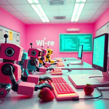 Bouncy chiptune-techno with bright square leads, playful arps, and a four-on-the-floor kick; verses stay tight on a filtered synth bass, chorus blooms with layered kids chorus and clap accents, tiny robot bleeps weaving call-and-response hooks, perfect for energetic STEM workshops