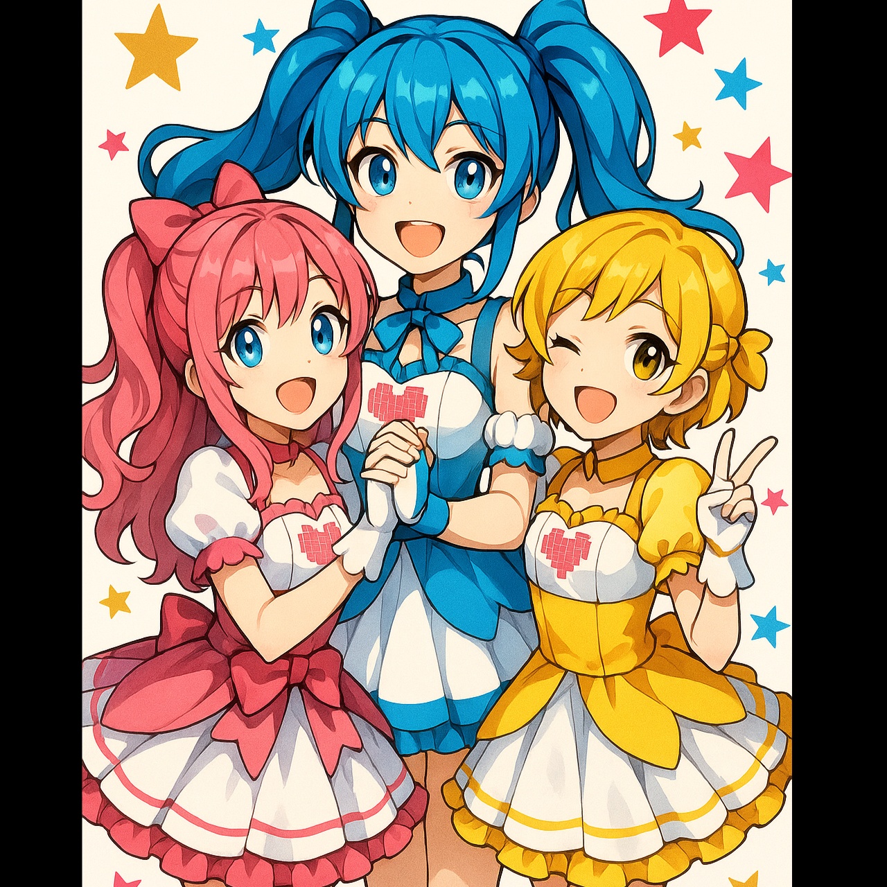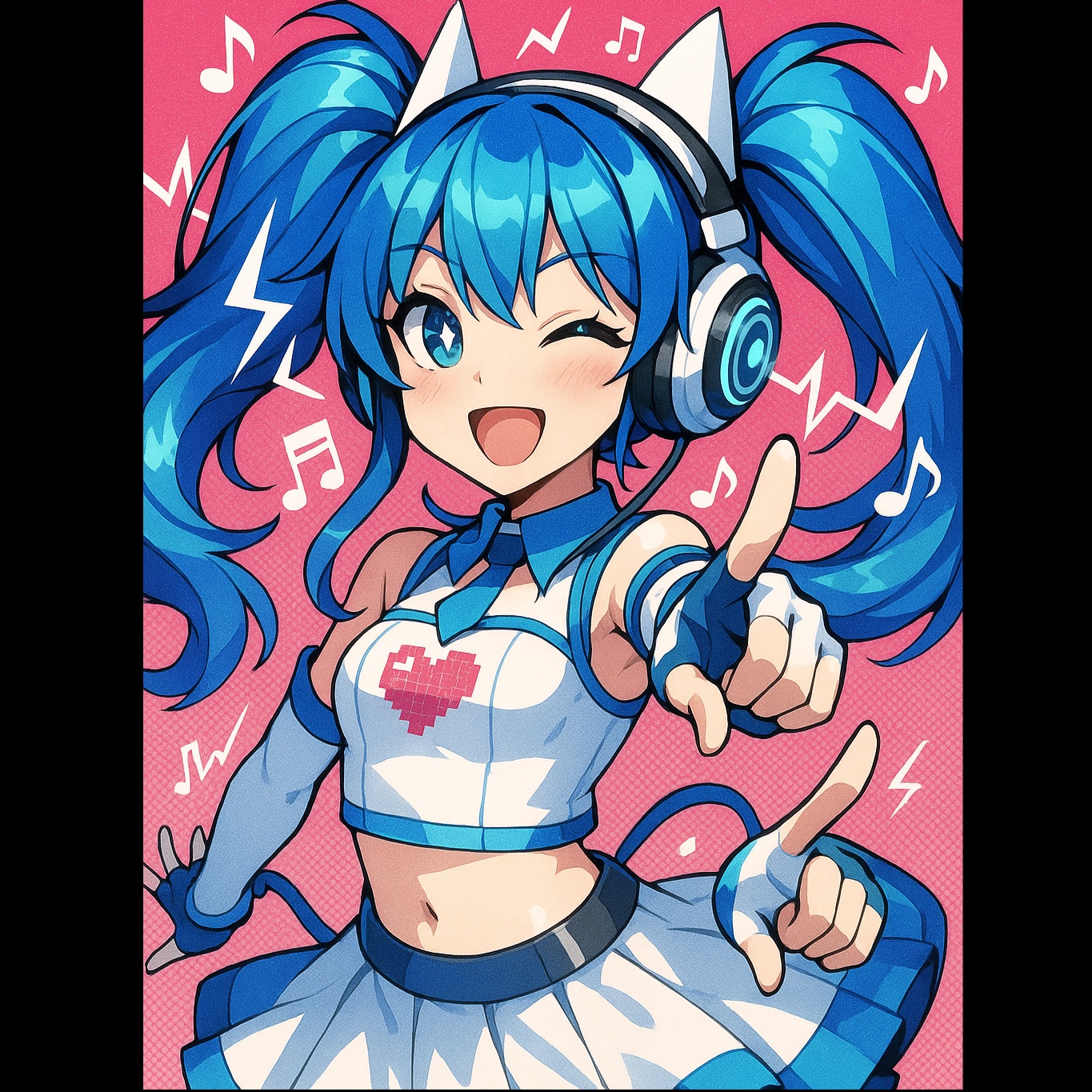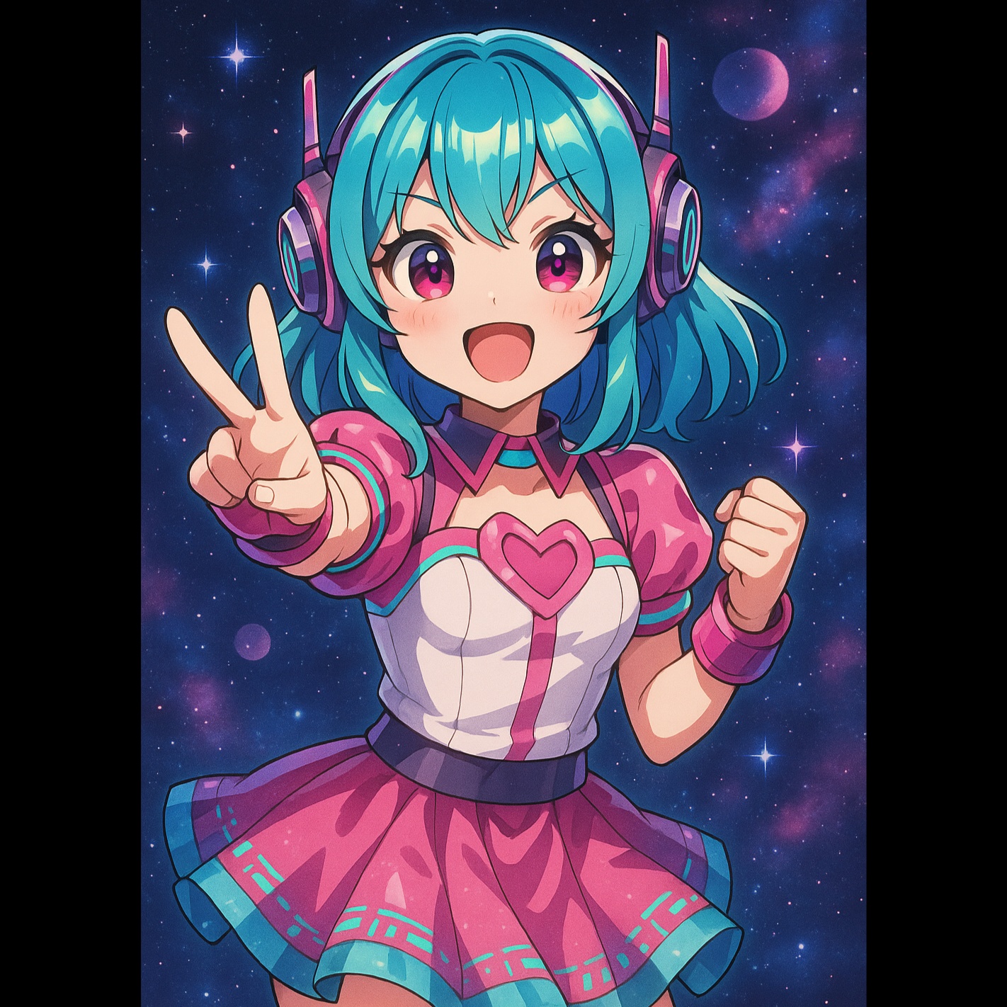 A high-energy Japanese electropop track powered by pounding EDM kicks, syncopated claps, and stuttering glitch elements, Frenetic chiptune leads weave rapid, hyper-melodic hooks above a foundation of driving bass, Aggressive but cute female vocals slice through with fiery, chaotic emotional delivery, each chorus drenched in layered harmonies and vocoder effects, Drops erupt into layered pixel synths, machine-gun percussion fills, and whiplash tempo changes, maintaining a relentless and overwhelming intensity throughout