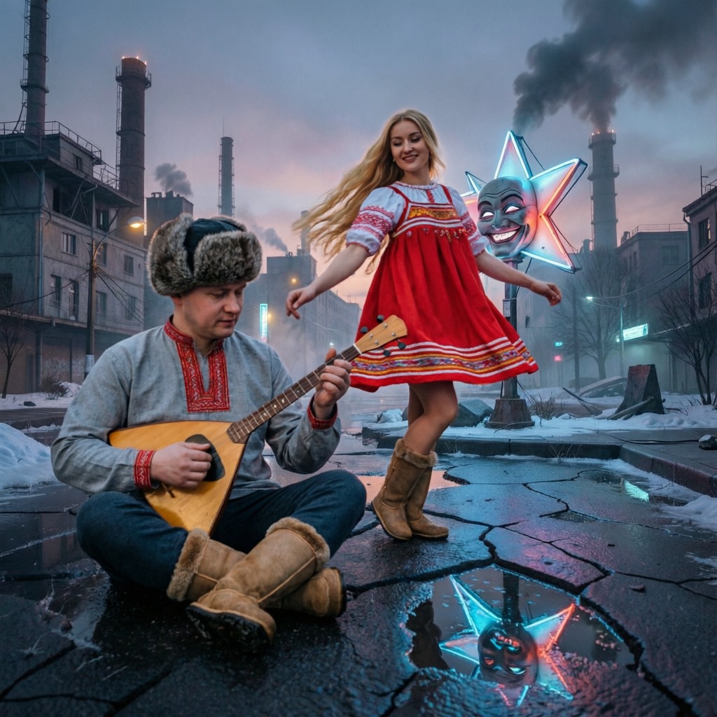 Balalaika, Create a Russian-language rap track blending melancholic, introspective lyricism with aggressive industrial-punk energy, Birchpunk, balalaika, symphony orchestra, emotional vocals, The vocal delivery should be raw and emotionally charged — alternating between rapid-fire, rhythmic flows and shouted, almost desperate refrains, Accompanying instrumentation includes distorted electric guitars, mechanical drum machines, analog synths, and gritty basslines, evoking a post-Soviet cyberpunk atmosphere, The mood is rebellious, existential, and urban, with themes of alienation, resilience, and late-night city solitude