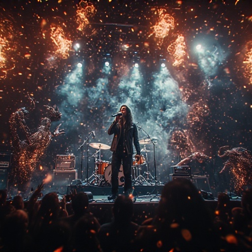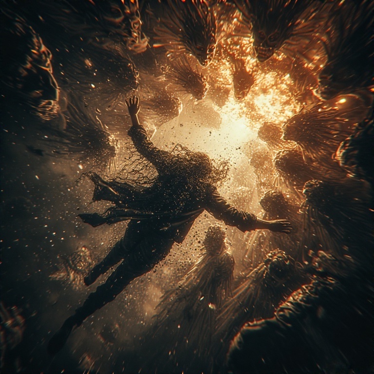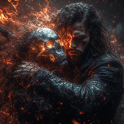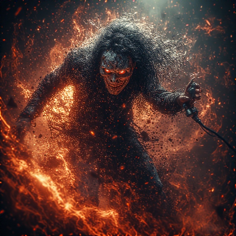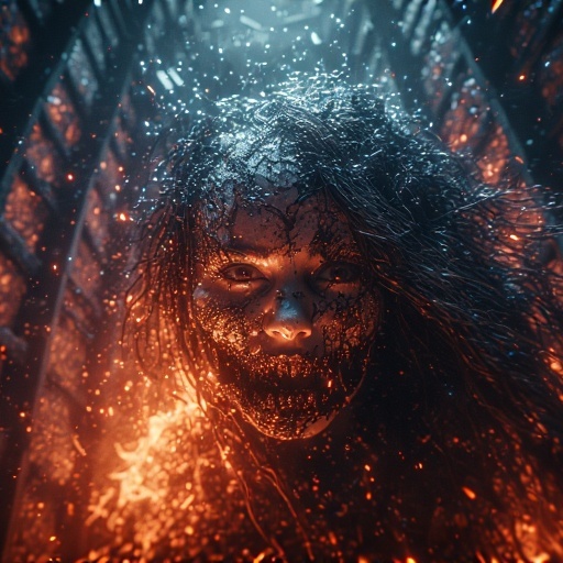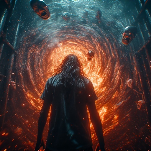 Dark industrial metalcore, powerful growls, heavy guitar riffs, complex riffs, thunderous drumming, fast double bass drumming, heavy bass, dark themes, dynamic breakdowns, baritone voice, darkwave
