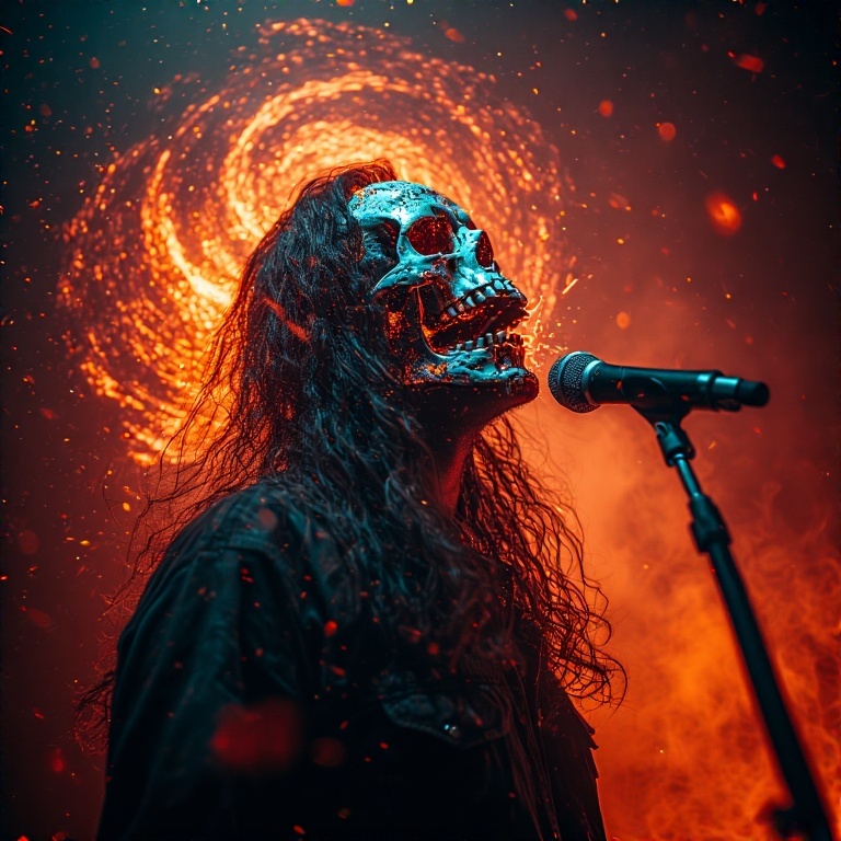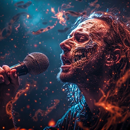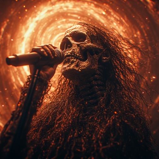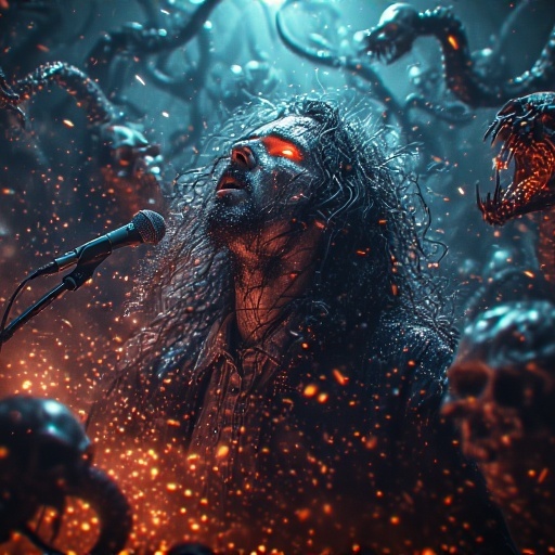 Darkwave southern Groove metal, deep baritone voice, powerful growls, heavy riffs, fast drumming, dark themes, dynamic breakdowns, complex solos, heavy drumming, heavy bass, haunting