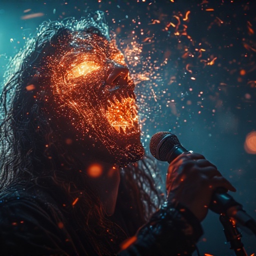 Slow tempo verses, heavy emotional Chorus with screams, heavy bass, loud drums, powerful guitar, complex riffs, hauntingly eerie vocals, electric sound effects