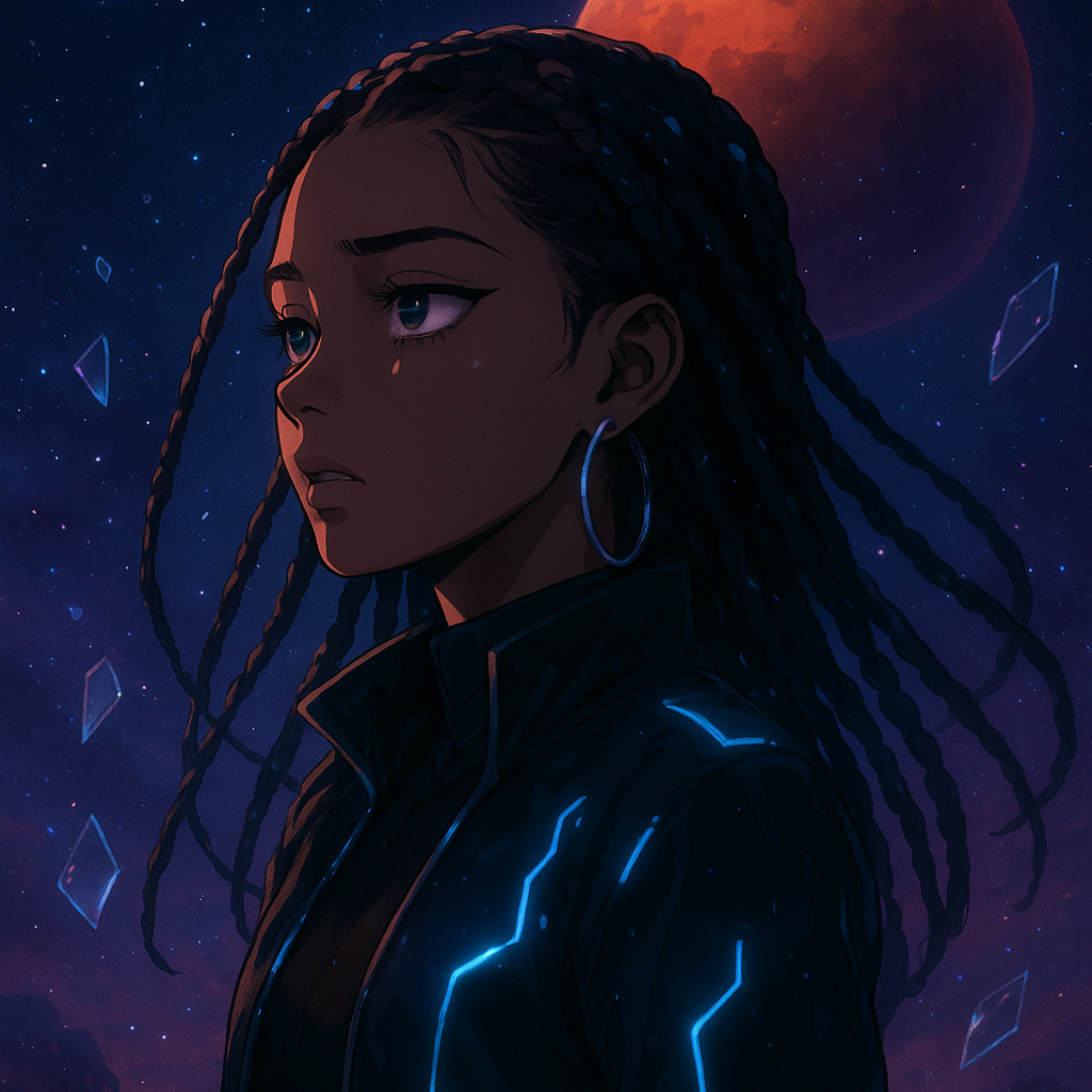 Black Female Futuristic trap x emo rap, 150 BPM, heavy 808 slides, sci-fi synths, cosmic pads, female melodic rap vocals with autotune and reverb, spacey interstellar vibe