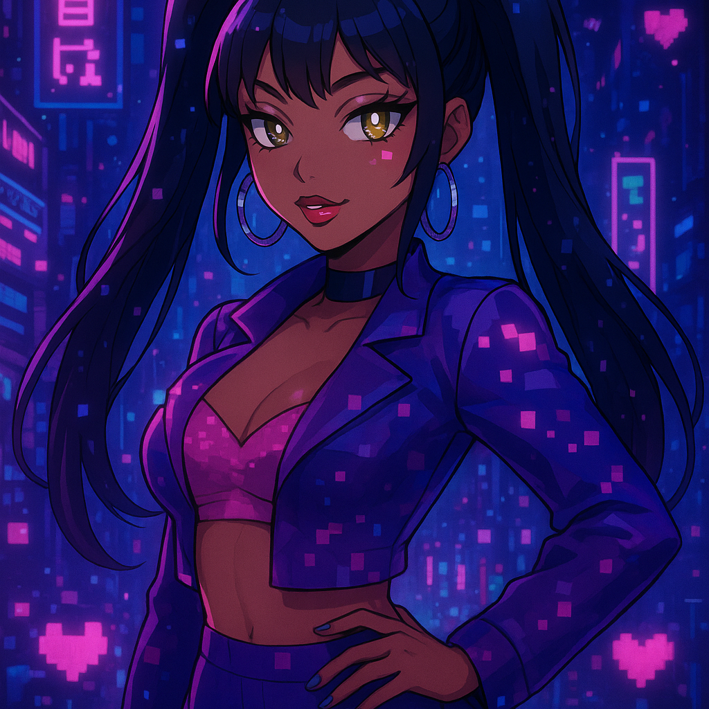 Female Futuristic trap-pop with heavy 808s, glitchy synths, digital arps, confident female rap, melodic R&B hooks, playful cyber vibe, pixelated echoes, high-energy swagger