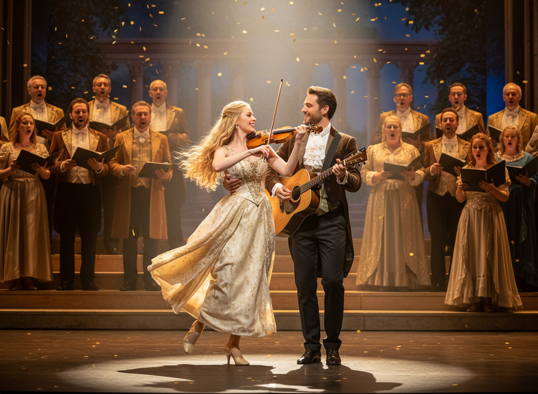 tender speech love duett, big room], philharmonic orchestra, cello, violine, flute, horn, trumpet, trombone, timpani, dark romamantic opera, child choir, big chorus, hopeful loving deep female voice strong, party, win win win, double bass, amazing electric guitar solo, catchy