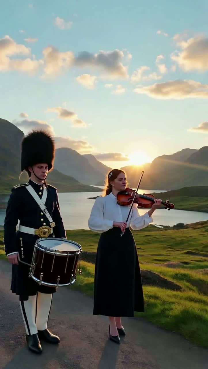 Bagpipes and snare drum, hymne of glorie, scottland highlands yells, amazing violin solo, big philharmonisches orchester, cello, violin, flute, trombone, horns, trumpets, dudelsack, timpani, big chorus, child choir, cheerful, loving party, hunting for respect, erlösend, catchy