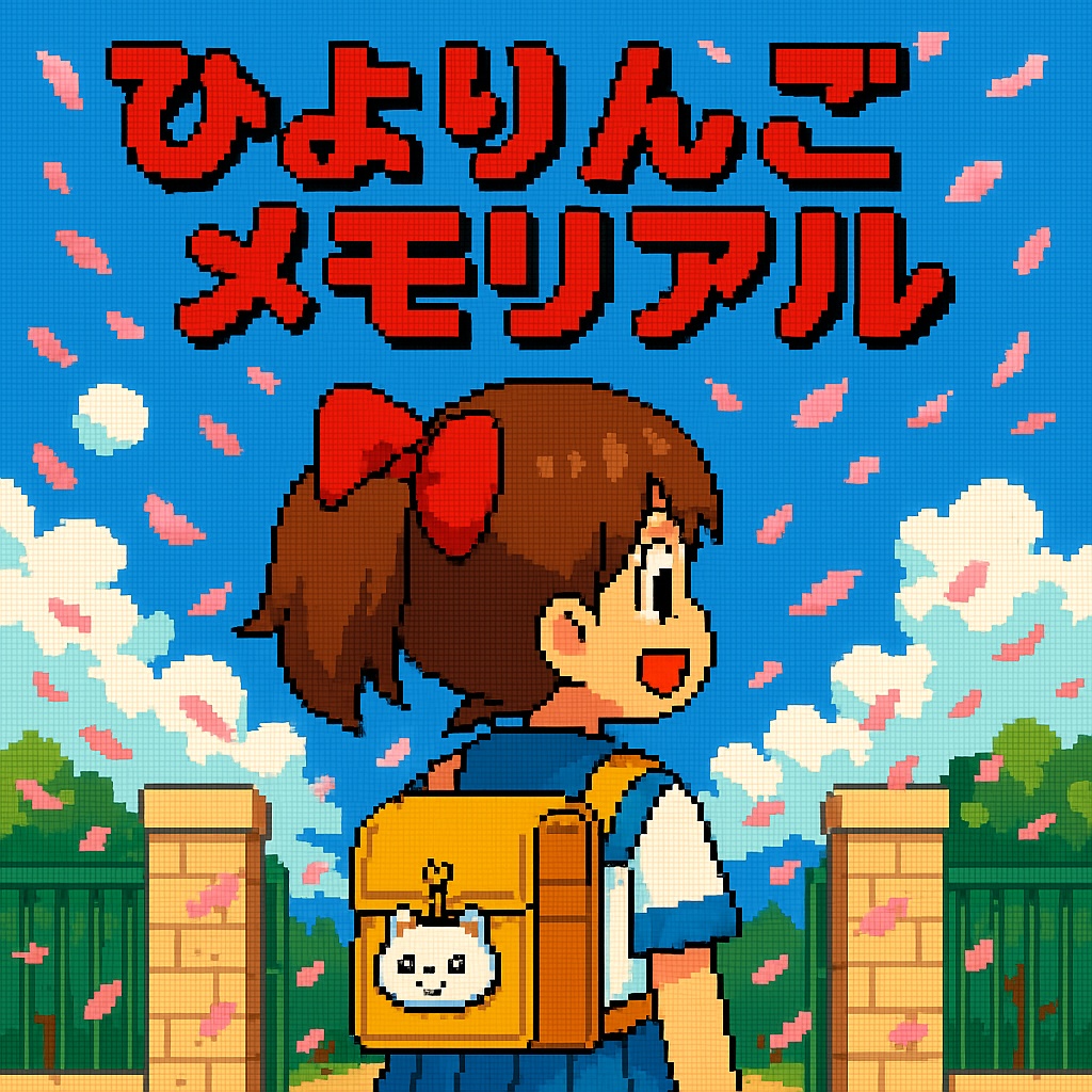 A nostalgic 8bit PSG chiptune opening theme for a fictional retro game titled “Hiyoringo Memorial”, inspired by classic Konami dating sims and Japanese mega demo culture, The track features sliding portamento leads, pulsing square wave basslines, glitchy noise channel effects, and a bittersweet but energetic melody, The tempo is upbeat (around 150 BPM), with a bright yet slightly melancholic progression, evoking the feeling of a forgotten summer memory, Includes unpredictable SE-like sounds reminiscent of early MSX demo tracks — such as reversed bleeps, abrupt stutters, or distorted cat meows, Style is strongly inspired by ANMA’s dark melodic style with a mysterious yet catchy theme, Ideal for use on an intro screen with starry pixel sky and a lonely silhouette of a girl with a schoolbag