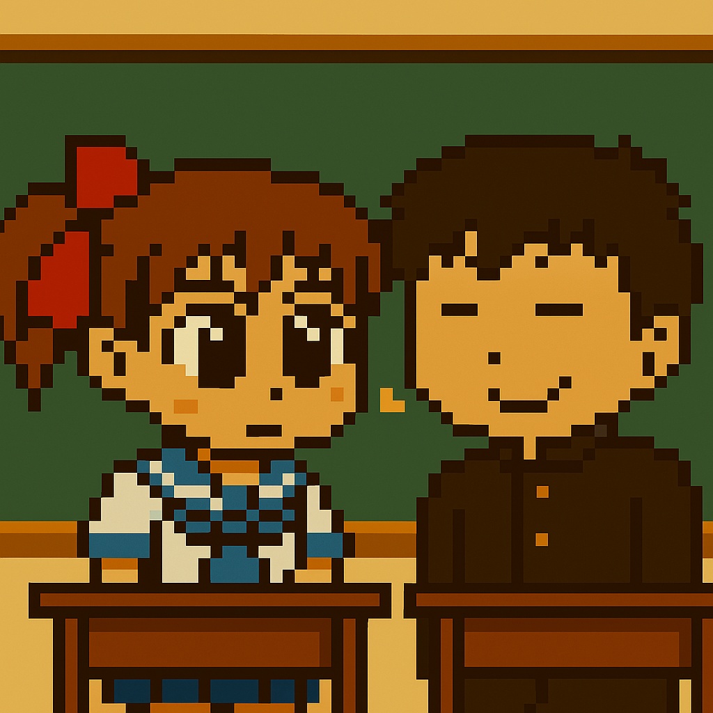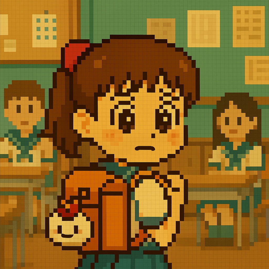 A soft, slow-tempo 8bit chiptune piece (around 100–110 BPM) that captures the shy yet heartwarming atmosphere of a schoolgirl on her first day of class, The melody is light and catchy, using square wave tones and soft portamento slides to express nervous excitement, Background harmonies are gentle, with a warm, playful bassline and delicate triangle percussion, The piece should sound like something from a retro slice-of-life game — cheerful but slightly hesitant, with a childlike innocence, Ideal for a classroom scene where the main character is fidgeting and shyly glancing around, hoping to make new friends