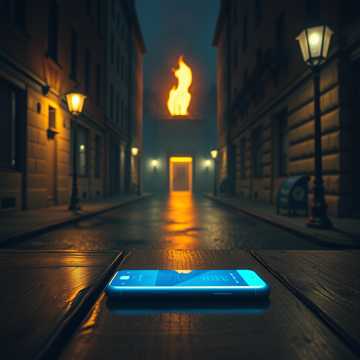 A cinematic, high-detail film still of a moody nighttime scene in a Glasgow tenement hallway (a "close"), A young couple stands in the shadows near a heavy wooden storm door, One person has a coat draped over their arm; a smartphone screen glows bright blue in the foreground on a small wooden table, The lighting is low and amber, coming from a streetlamp outside reflecting off wet pavement, Gritty textures, sandstone walls, a sense of secret intimacy and "the big light" being off, R&B, Rap, techno, Shot on 35mm film, slight grain, melancholic but warm atmosphere