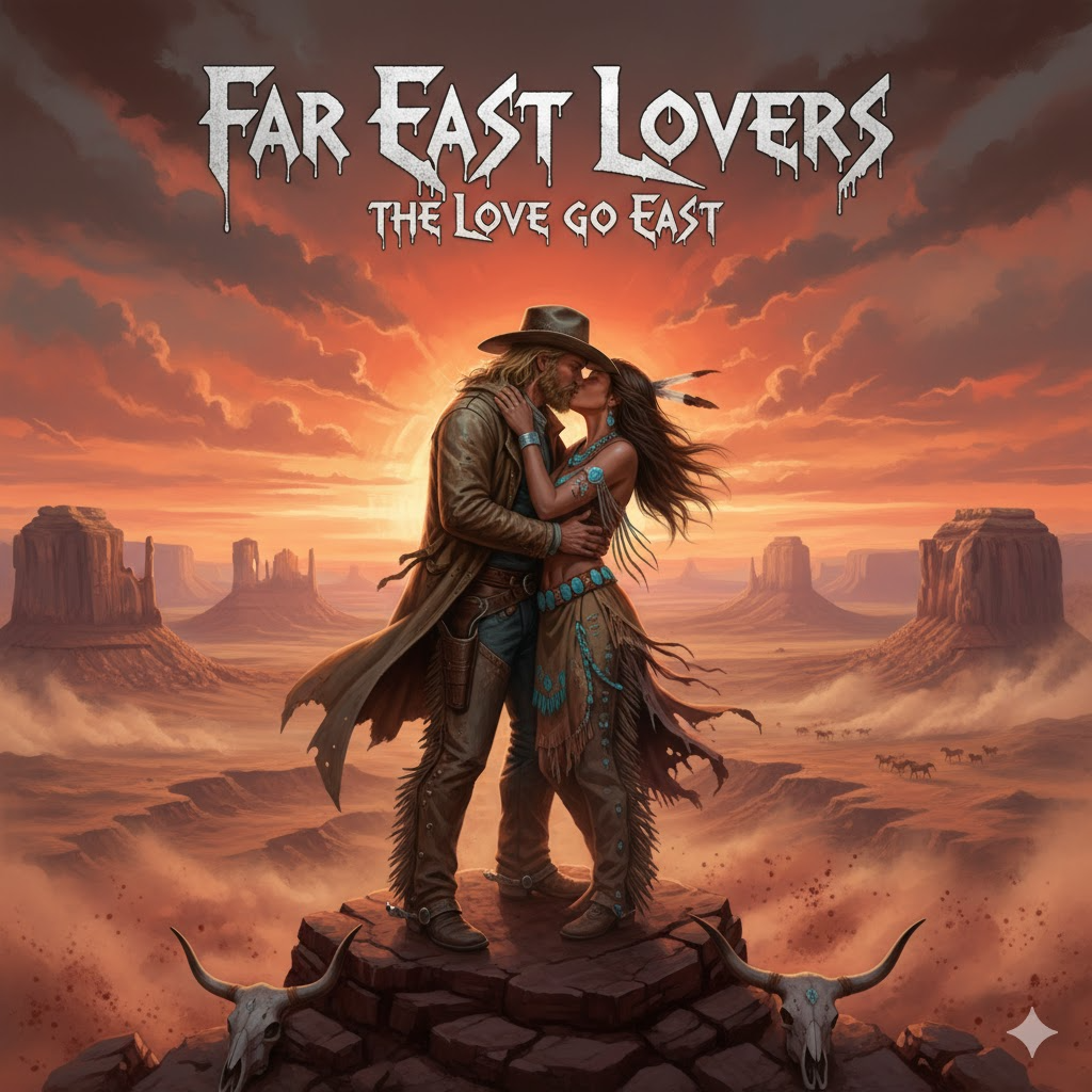 A Far West era style opening features twangy acoustic guitar, rolling snare patterns, and a lone harmonica setting a dusty, cinematic atmosphere, Upright bass gently anchors the rhythm while subtle slide guitar adds texture, evoking classic Americana before modern instruments join in, A soaring melodic glam rock track with lush keyboards forming the harmonic bed, driving guitars punctuating the arrangement, and energetic, punchy drums, Verses are driven by clean, syncopated riffs with synth accents, building to an anthemic chorus featuring layered vocals and expressive guitar leads, with lead and electric guitars solo 45sec duration, before closing with a triumphant, dynamic solo section and refrain
