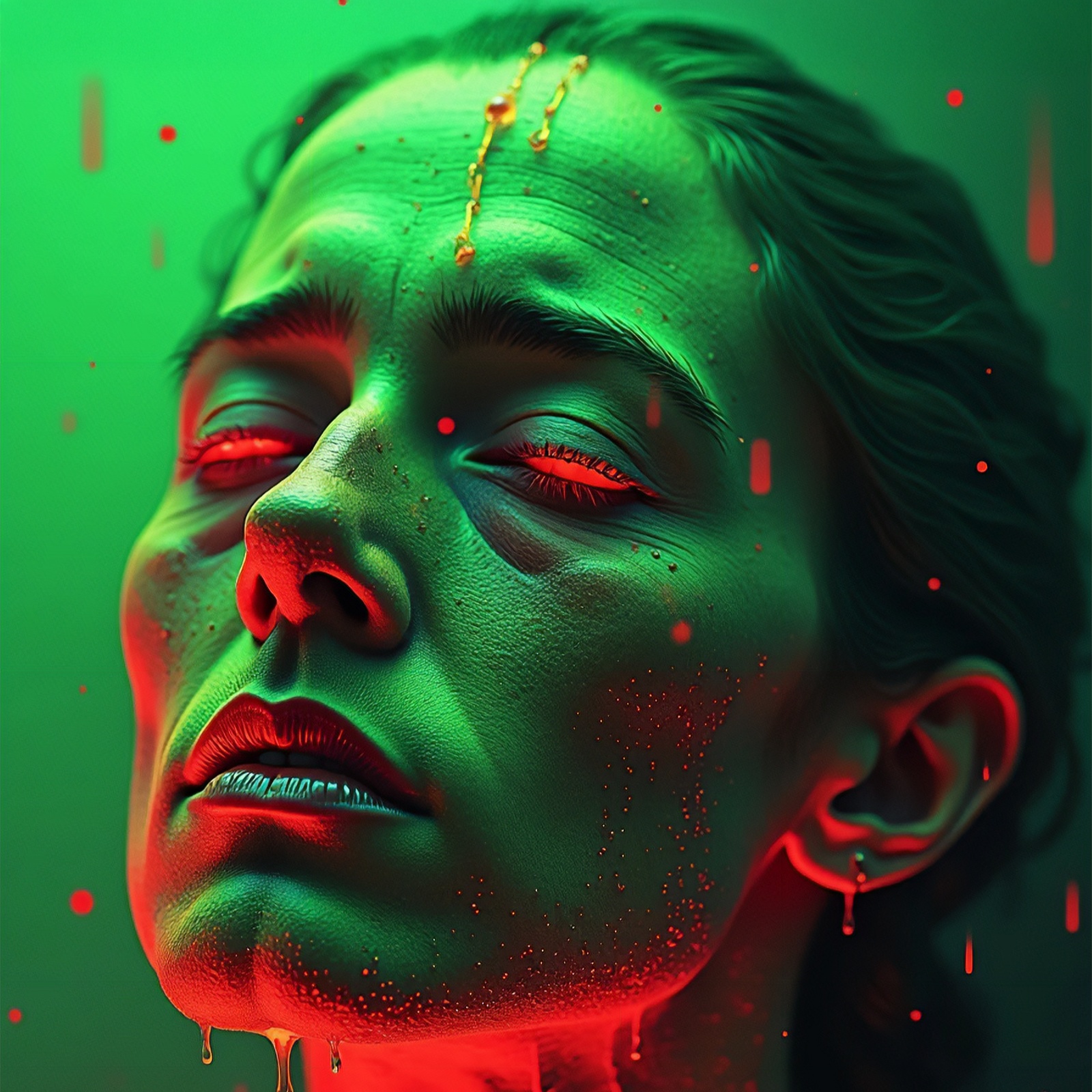 Genre blend of glitchcore, lo-fi experimental pop, and cinematic ambient, Starts with intense chaos: broken beats, harsh digital glitches, pitch-warped vocal fragments, distortion, static pulses, and mangled textures—like a system breaking down, Noisy, moody, unstable, Then slowly transforms: rhythm slows, noise dissolves into ambient pads, soft reversed piano, warm analog synths, and acoustic guitar, Lo-fi drums and gentle strings emerge mid-song, Vocals evolve from glitched and distant to intimate, breathy, and emotionally clear, Huge dynamic shift—goes from fragmented and haunted to soothing, resilient, and beautiful, Emotional tone: painful to healing, shadow to light, like watching storm clouds break into golden calm
