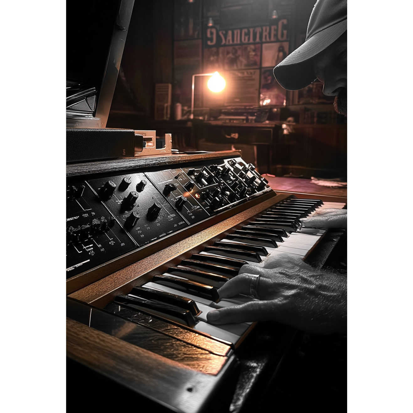 Darkwave / drone synth / deep synth-alt-folk with industrial Afrofuturist edge, Tempo slow-mid (70–90 BPM), Intro: low dark drone synth, subtle noise, Verses: minimal beat, detuned electric guitar, intimate off-tune vocal, Pre-Chorus: add pulse bass, rising Hammond organ, Chorus: simple, sticky melody, stacked vocals, punchy low-end, Instrumentals: evolving drones, hand percussion, feedback textures, Bridge: strip down to voice + organ, Final chorus: full wall of sound, dynamic peak, controlled chaos, Outro: long decaying drone, no autotune, raw human feel