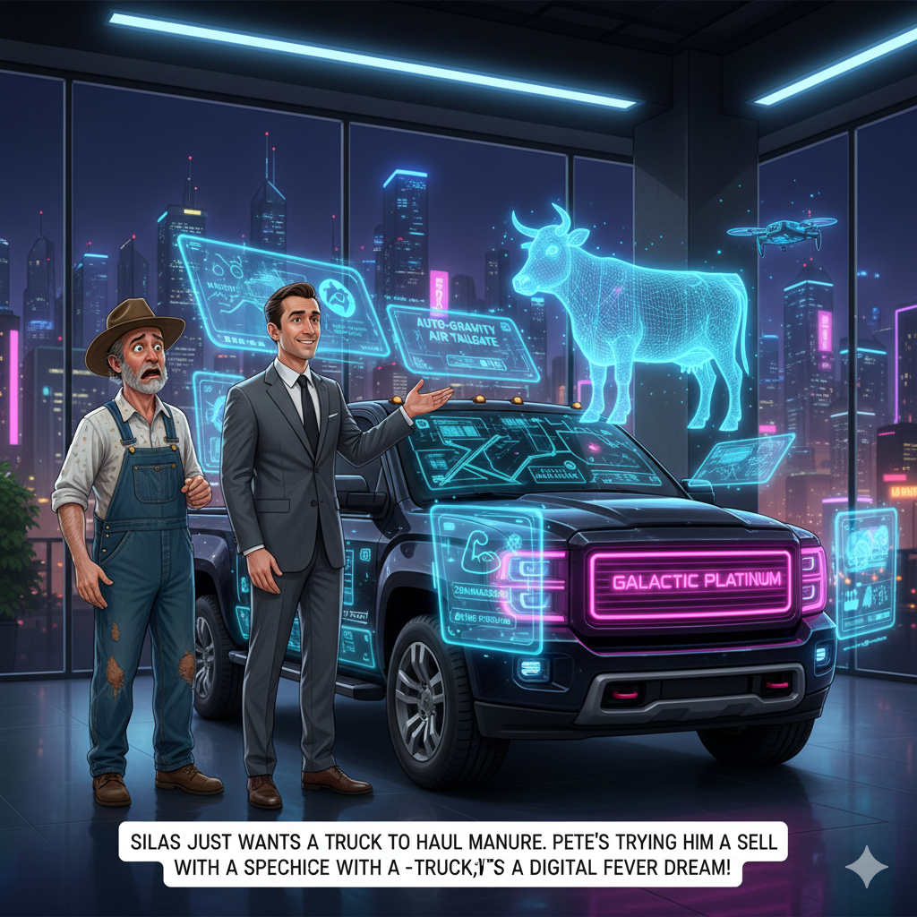 [STYLE: 110 BPM, Country-Funk-Synth Fusion, Groovy slap bass, bright acoustic rhythm guitar, twangy pedal steel interjections, and playful 'bloop' synthesizer arpeggios, Female vocalist: Playful, witty, conversational twang, very clear pronunciation, ]