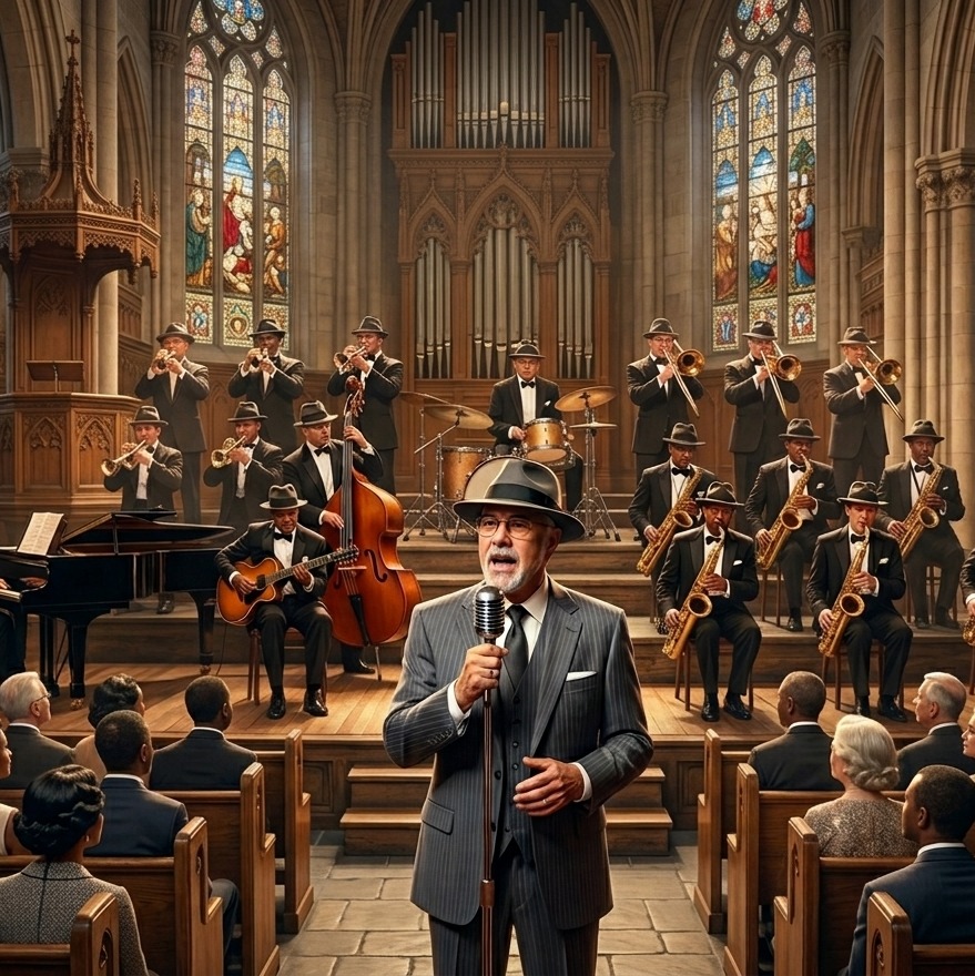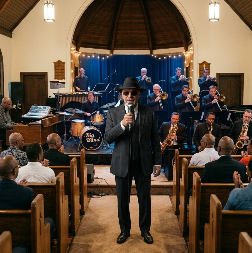 trumpet sax trombone twangy fender telecaster rock and roll guitar solos warm church hall acoustics with natural reverb lead vocals deep male baritone similar to Traditional pop, Jazz, Swing, Big band rich chest voice warm storytelling delivery with a subtle southern country twang high lyrical clarity conversational but melodic