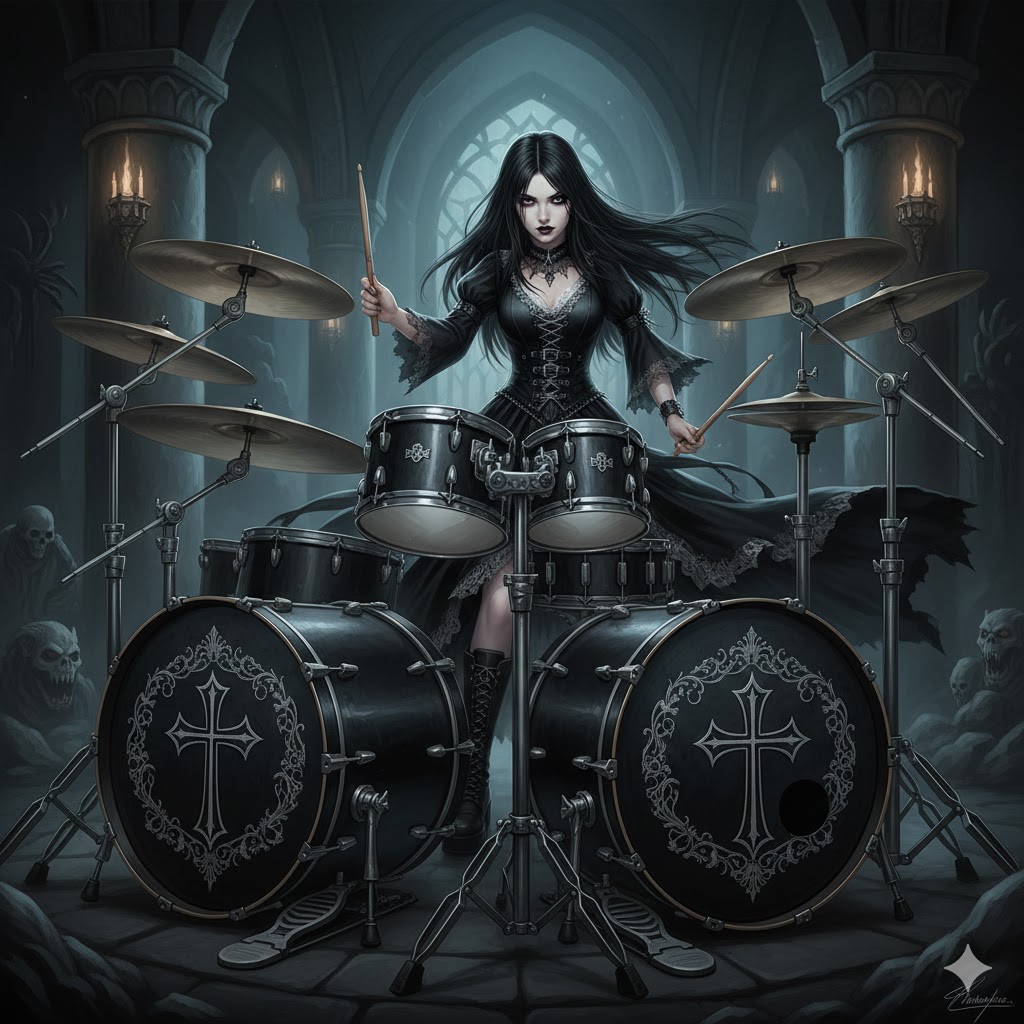 Industrial Metal, Gava, Electric Gothic Rock, Minor, 120 BPM, Female Soprano Vocal, Electric Guitar (Distorted tremolo picking), Electric Guitar (Harmonic feedback sustain), Acoustic Guitar (Palm mute arpeggio), Acoustic Guitar (Fingerpicked tremolo), Bass Guitar (Picked aggressive staccato), Bass Guitar (Slap and slide), Drums (Double bass blast beats), Drums (Syncopated fills), Synthesizer (Dark atmospheric pad), Synthesizer (Sharp lead melody), Dark intense industrial gothic sound