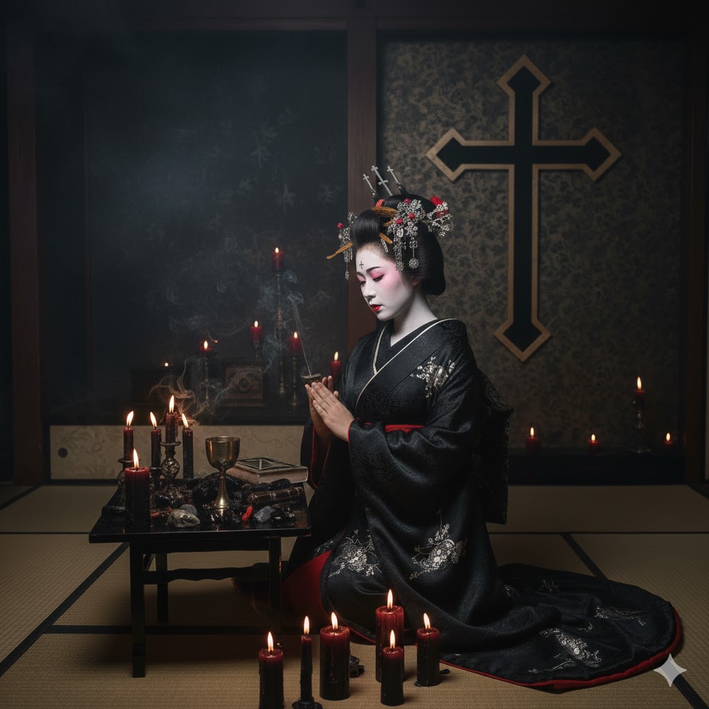 Japanese Classical Gothic with a dark “Black Mass” atmosphere, featuring distinctly gothic melodic motifs and haunting minor-scale progressions woven into the arrangement, Melodic and ritualistic metalcore sound design mixed with traditional Japanese instruments such as koto, shakuhachi, and temple bells, Include expressive, flowing gothic-style melodies that feel ancient, elegant, and ominous, Female singer with a clear, seductive, bewitching tone; rhythmic and melodic, with hints of Kyoto Maiko-style speech patterns, No death growls, no harsh vocals, no guttural or roaring voice, The overall mood is dark, mystical, ceremonial, and gracefully dangerous, Gothic melodic lines intertwine with black-magic-inspired production, creating an enchanting and dramatic atmosphere, Hypnotic metalcore beats combined with ritual Japanese timbres, Use dynamic expression throughout the track, The final mix must have clear vocal clarity, ‑death growls, ‑harsh vocals, ‑guttural vics, ‑roaring voice, ‑rap