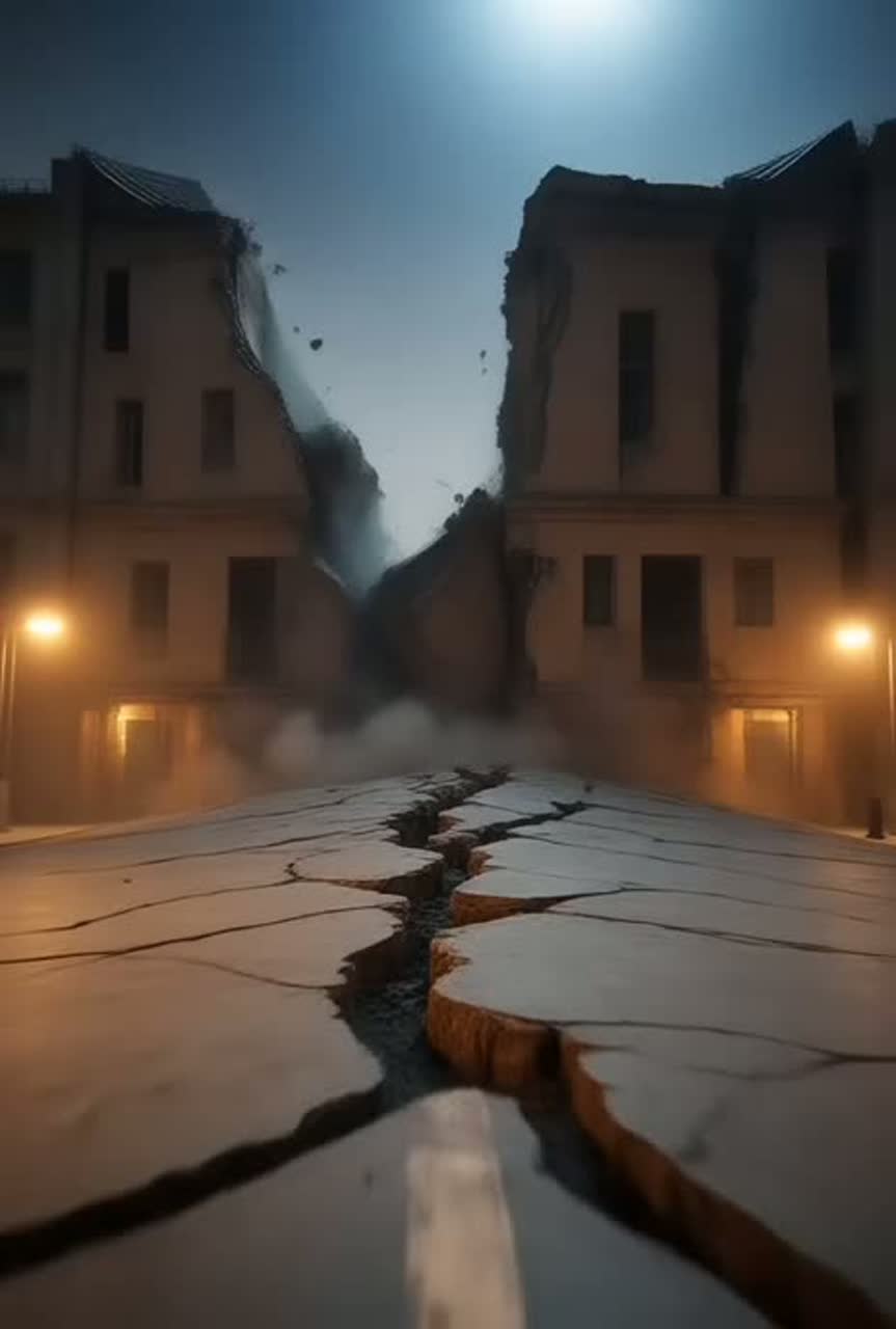 Gothic Rock, Industrial, Noisecore, Minor, 120BPM, Deep Male Growl Vocals, Distorted Electric Guitar (harsh tremolo with feedback swells), Distorted Electric Guitar (dissonant power chords with aggressive picking), Industrial Percussion (metal hits with rhythmic chaos), Electronic Noise Layers (static, low rumble, crackling), Bass Guitar (heavy gritty sustain with slow slides), Synth Pad (dark ambient textures with tension build), Overall Impression: chaotic, oppressive, terrifying, earthquake tremor, dust and debris, panic of fleeing people, collapsed buildings, nightmarish atmosphere