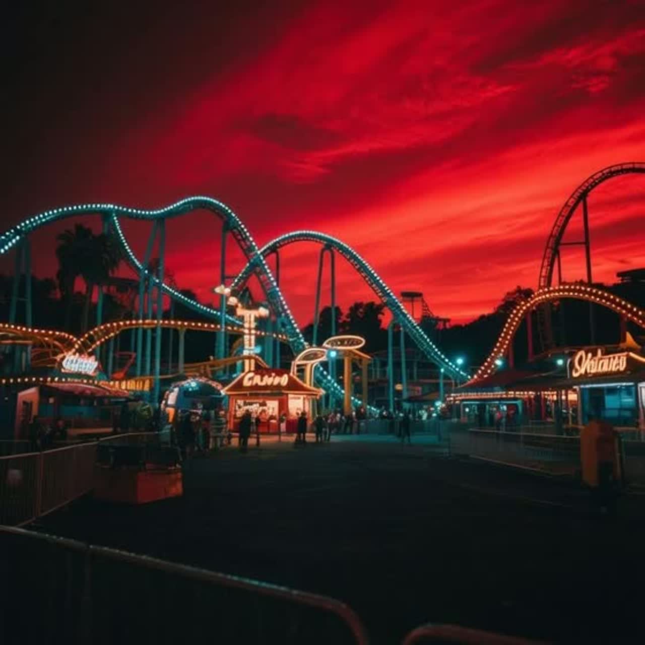 gothic rock × industrial rock, BPM120-130, band style with heavy electric guitars, distorted low riffs, mechanical percussive hits, metallic clanks, glitch noise fragments, marching-like drum patterns, deep bass groove, darkwave synth layers, haunting choir pads, twisted carnival atmosphere, tension-building pre-chorus, explosive anthem chorus, eerie music box accents, bright yet translucent male vocals, expressive and slightly unhinged delivery, energetic groove that still feels dangerous, chaotic surreal imagery, dissonant melodic intervals, short glitch breaks, industrial transitions, dramatic build-ups, sinister fairy-tale vibe, emotional darkness mixed with playful madness, overall atmosphere: deranged yet catchy gothic industrial rock for a twisted theme-park world