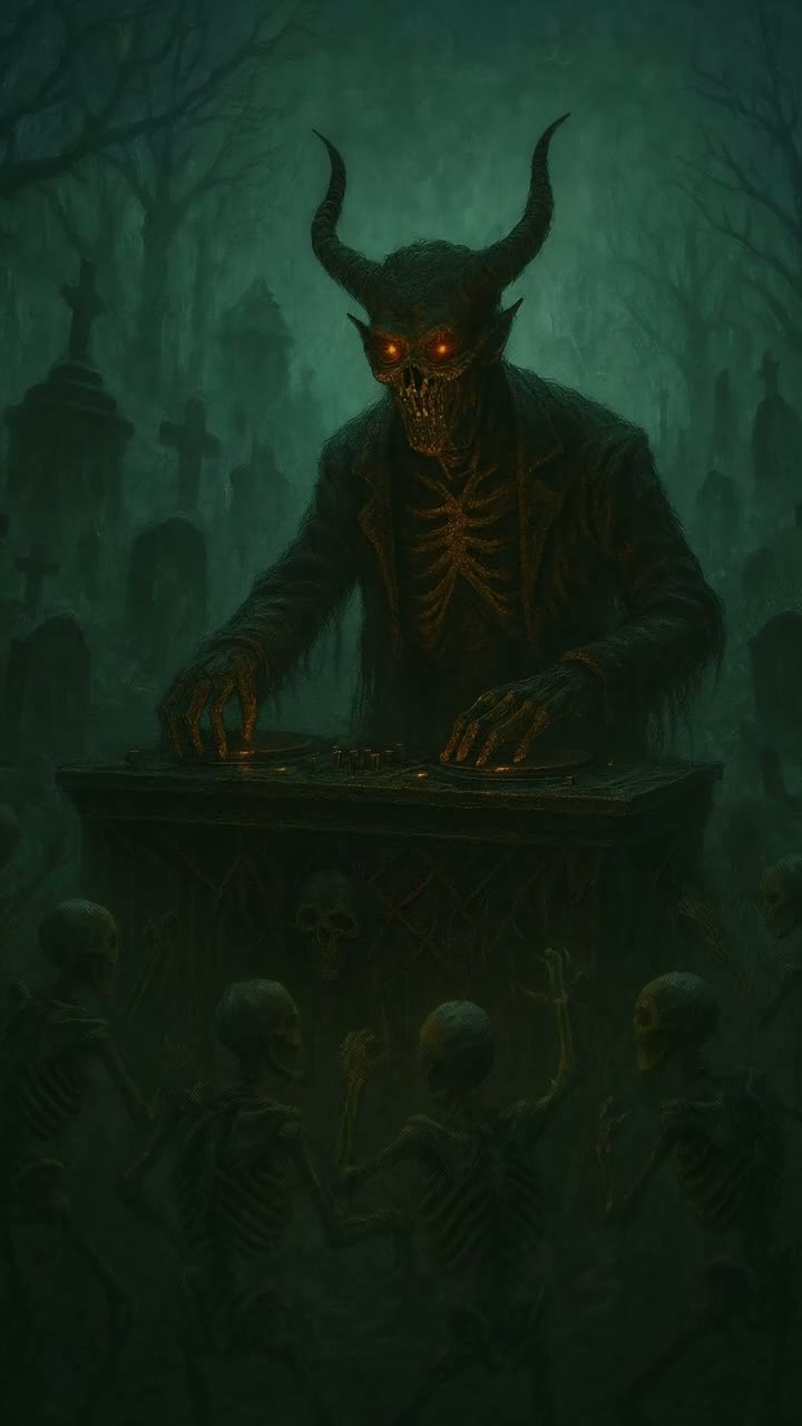 Dark techno remix of “Boneyard Bounce” reimagined as a haunted graveyard ritual, Replace the fun, retro tone with a terrifying, cinematic atmosphere, Deep industrial drums, metallic hits, distorted basslines, and ghostly reverb, Whispered demonic French female voice describing the graveyard awakening — eerie and breathy, close to the mic, Include creepy ambiences: wind through tombstones, distant thunder, echoing screams, crumbling earth, and whispers repeating “do the boneyard bounce…” in a haunting tone, Mid-section: all sounds stop except dripping water and faint rattling bones, then slowly rebuild into an explosive final drop, 134 BPM, dark, hypnotic, ritualistic, immersive — a cinematic techno descent into the grave, Theme: The dead rise to dance one last time in the cemetery, under the moonlight