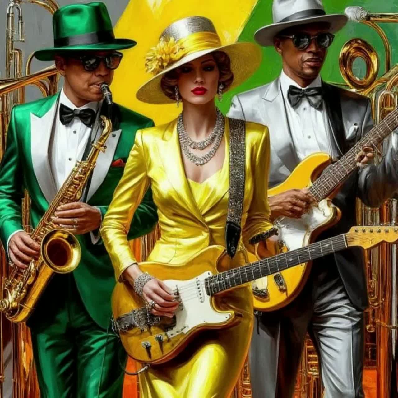 This experimental avant-garde, uptempo vogue rockabilly track opens with funky clean electric guitars drenched in wah and chorus, punched by bright synth or real brass stabs, A punchy slap bass locks in with a tight drum groove—snare rolls, syncopated hi-hats—while a funky clavinet riff drives the verses, DUET vocals deliver energetic, soulful lines with playful ad-libs, building into layered harmonies for explosive choruses, The bridge strips to filtered drums and rhythmic vocal chops, before dramatically returning to a final chorus bursting with full brass, layered guitars, and stacked harmonies, Studio-quality, wide, mastered mix with a bold, contemporary edge, Theatrallity, Cinematic