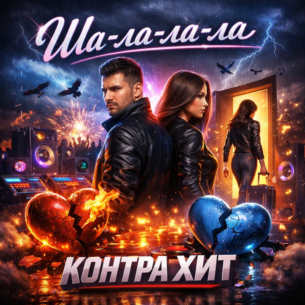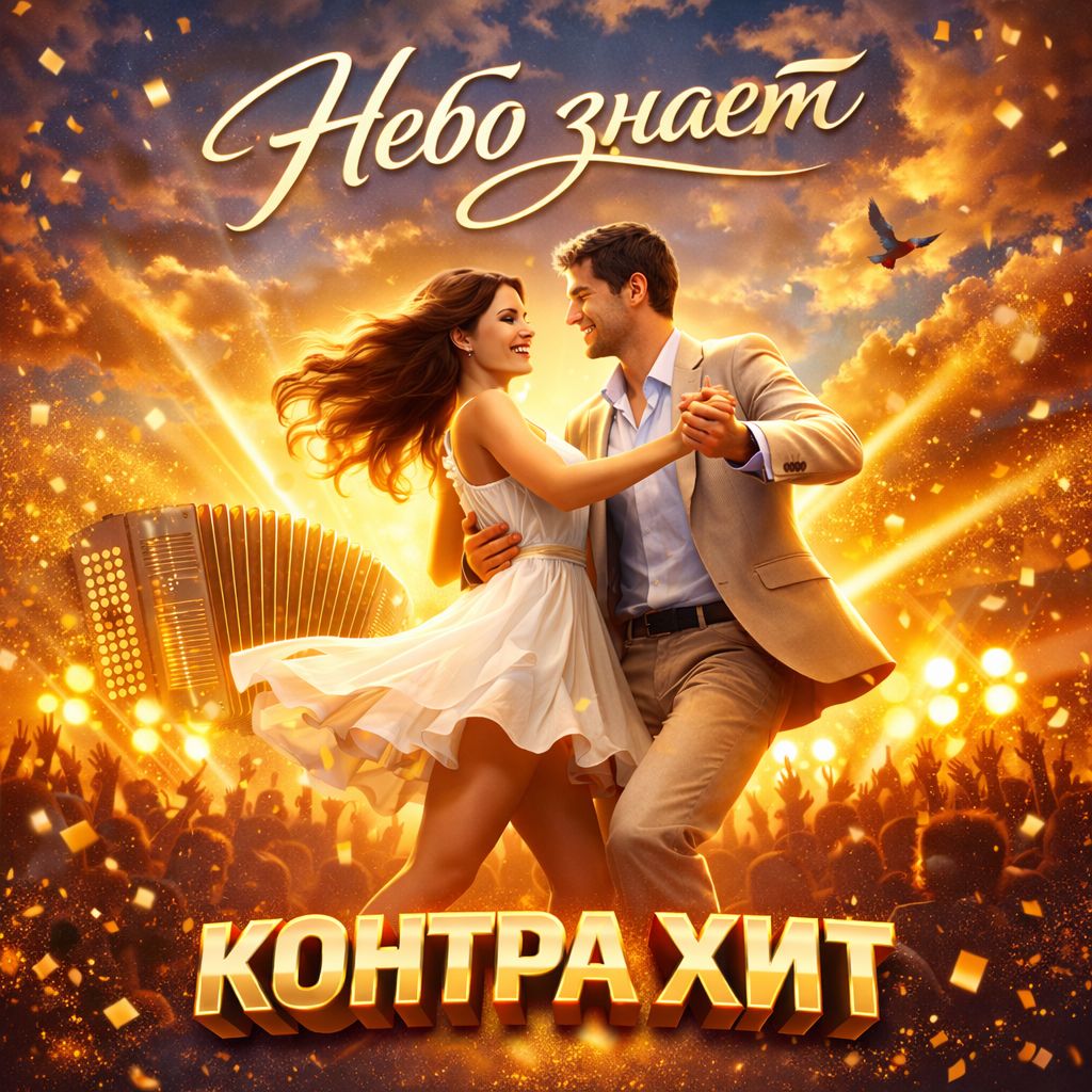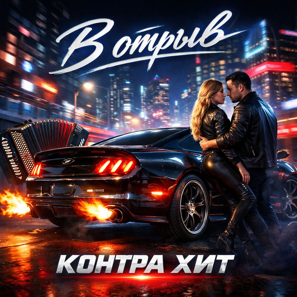 • Male vocal — low, rough, velvety baritone, confident, rhythmic, slightly hoarse, dominant presence, • Female vocal — young, clean, cool, rhythmic, energetic, modern dance style, Clear duet balance, no choir, Arrangement: fast rhythmic verses with pauses, explosive big-drop chorus with massive bass and loud rhythmic accordion lead, strong club drive, Bridge with beat drop and deep sub-bass pulse only, Aggressive rhythmic accordion solo in outro, Restrictions: no acoustic guitars, no emotional sadness, no crying tone