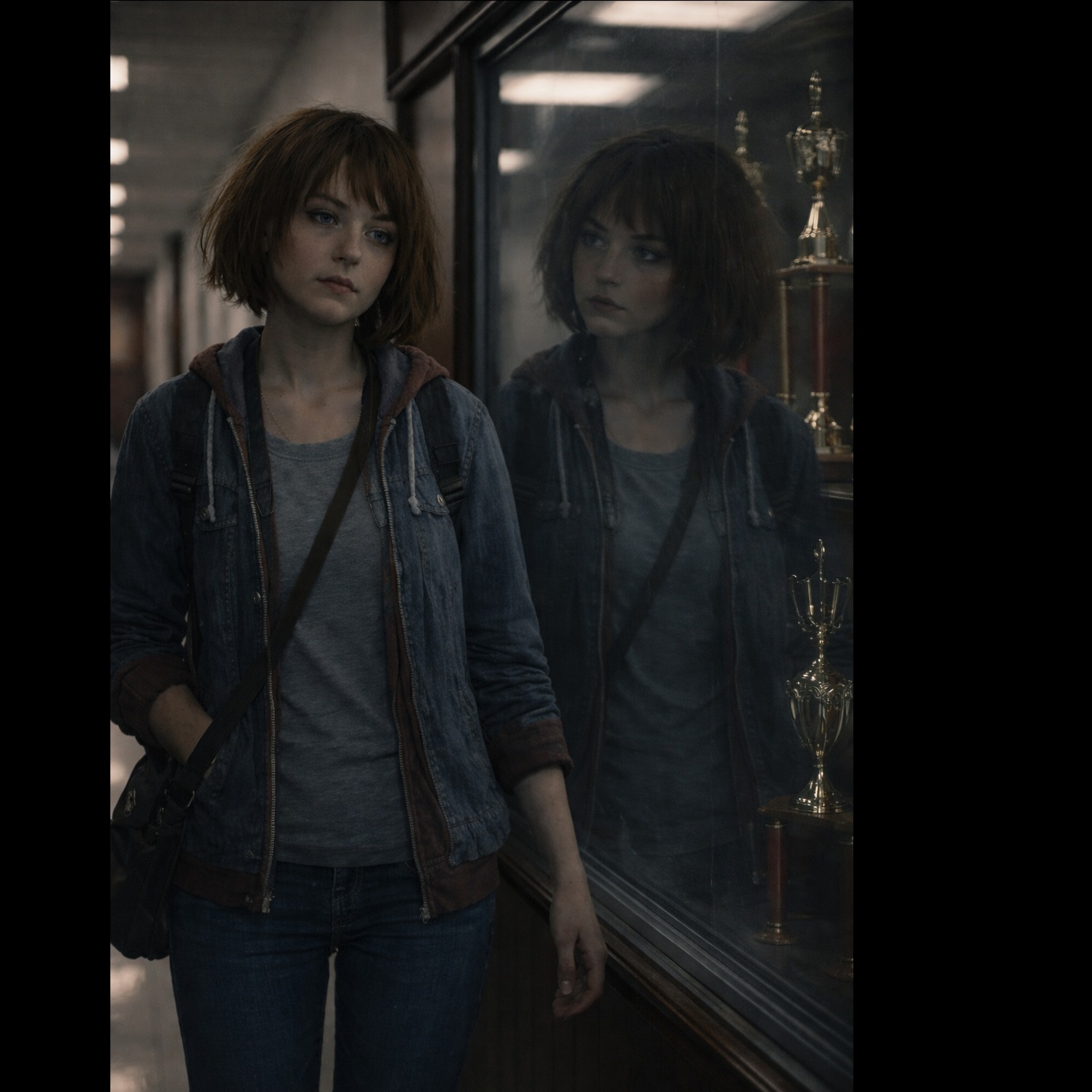 Cinematic ambient, detuned upright piano motif, warped 4-note reset, reversed locker textures, distant hallway reverbs, breath-heavy layered female vocals slightly out of sync, sub-bass pressure drone, analog tape degradation, stretched field recordings (footsteps, fluorescent buzz), minimal distant percussive thuds, psychologically tense, memory-decay atmosphere