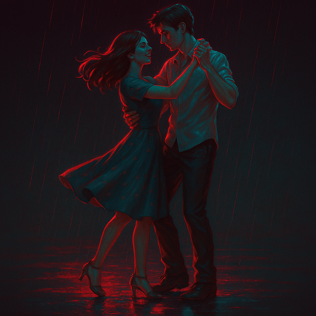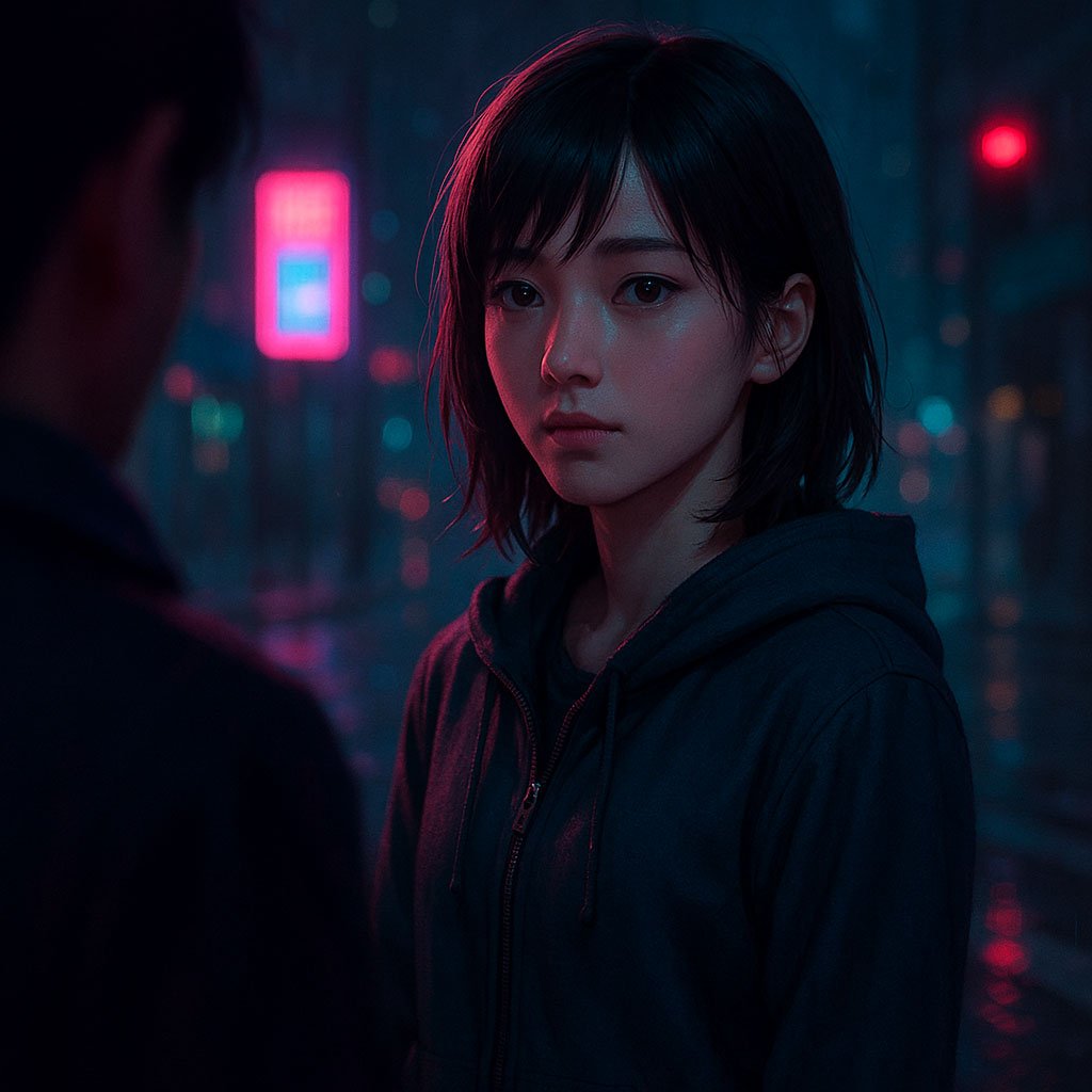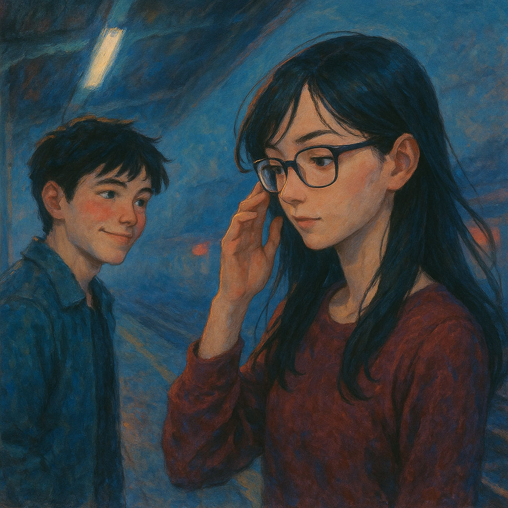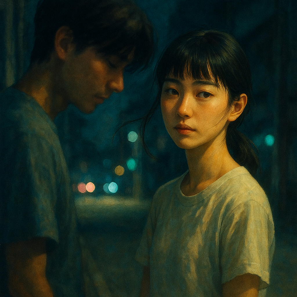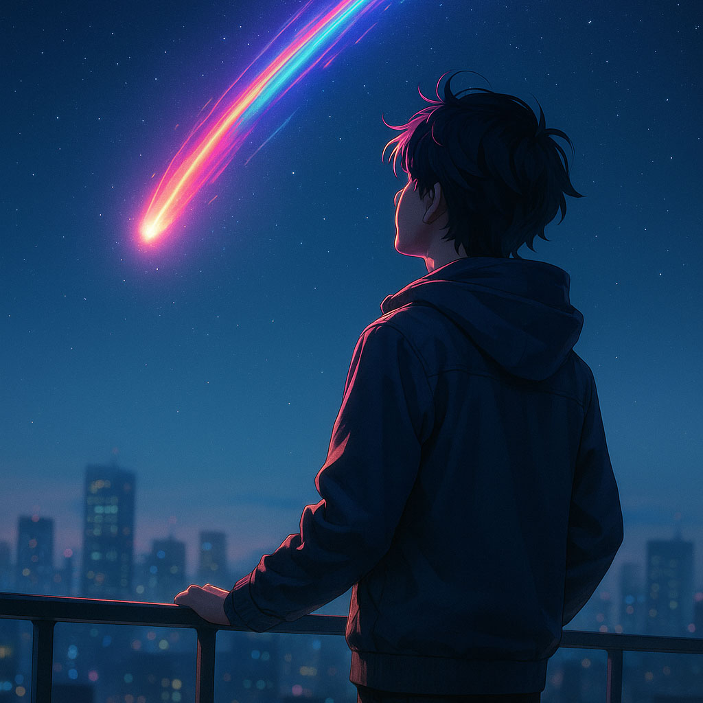 cinematic city-pop x alt-jrock fusion with emo revival undertones, nostalgic twilight vibe, live concert, tight live-band mix with crisp drums, shimmering chorus guitars, melodic bass runs, and airy synth pads under rain-soaked ambience, expressive male vocals with bittersweet delivery, themes of fleeting connection and quiet admiration, warm yet wistful tone like an anime end-scene, emotional dynamics between playfulness and yearning, clean production with subtle analog grit