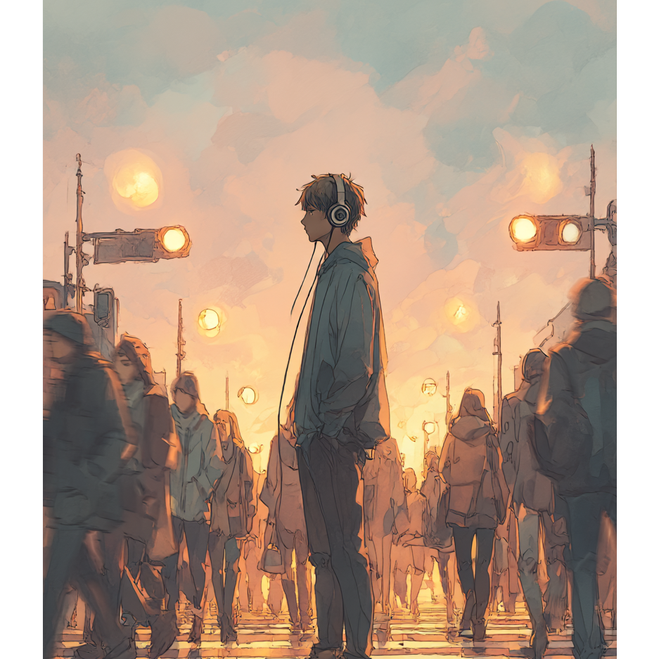 A laid-back alternative rock track with a melancholic yet rhythmic vibe, The intro features a clean, arpeggiated guitar riff that sets a reflective and slightly nostalgic tone, evoking a sense of longing, The instrumentation includes smooth bass lines, steady mid-tempo drums, and an ambient guitar layer that enhances the spacious atmosphere, The vocal delivery is contemplative, blending Japanese and English seamlessly, with a catchy and emotionally charged chorus that highlights the frustration and confusion of modern digital overload, The song's dynamics build gradually, maintaining an organic band sound while incorporating subtle effects like reverb and modulation to create a dreamy yet critical ambiance, The overall mood is introspective, capturing the overwhelming nature of information saturation with a hint of melancholy