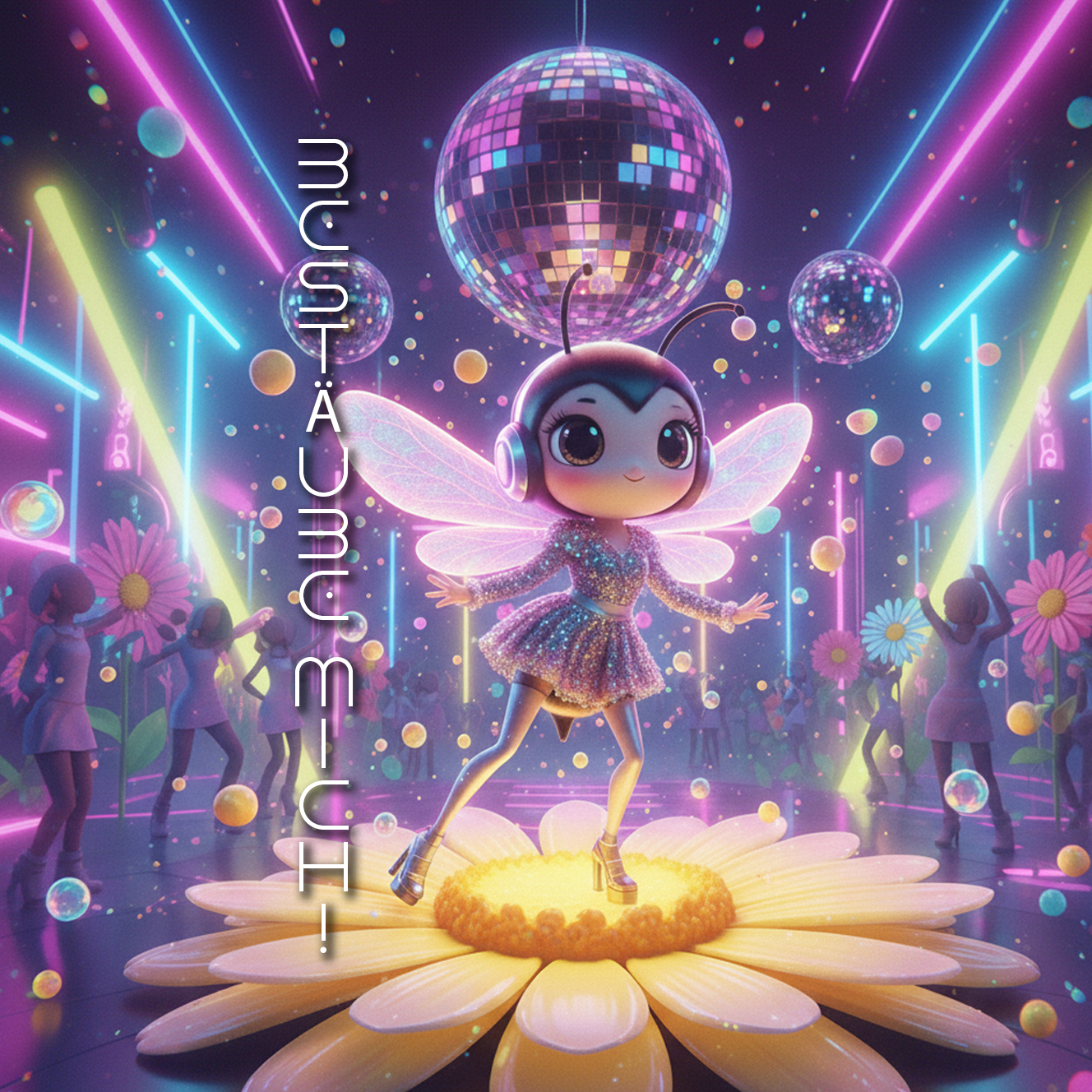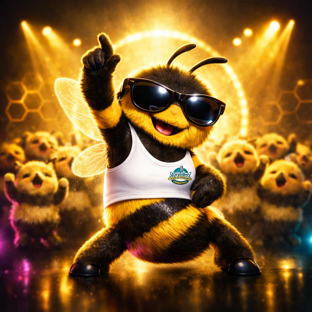 A punchy electronic dance beat anchors the track, layered with buzzing synths mimicking a bee’s relentless rhythm, German rap verses bounce energetically, interspersed with playful vocal effects, Funky bass and quirky horn stabs add comic flair, with breaks for crowd-rousing call-and-response