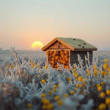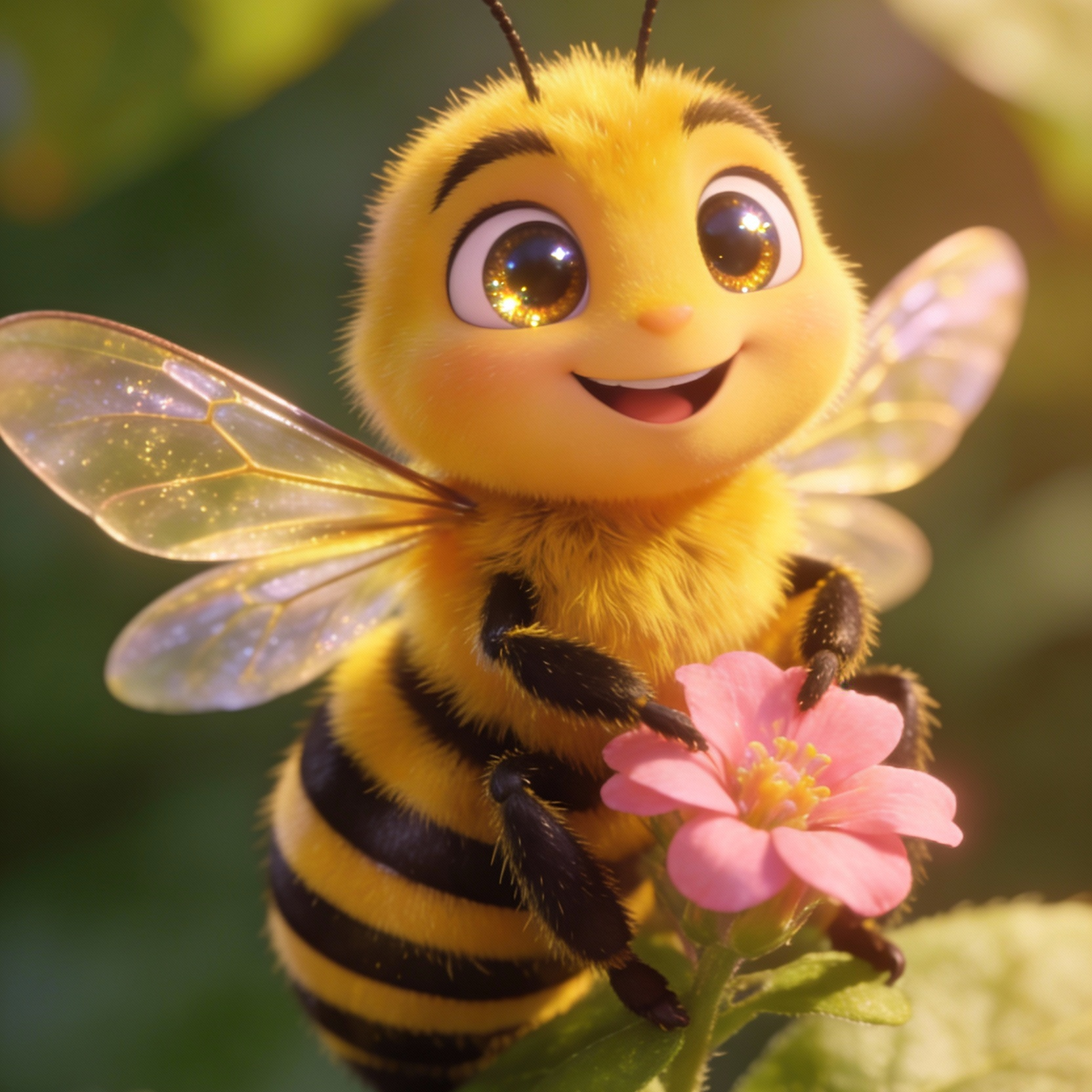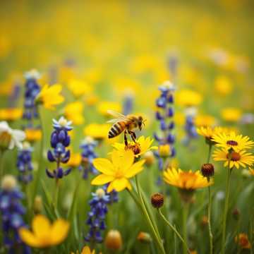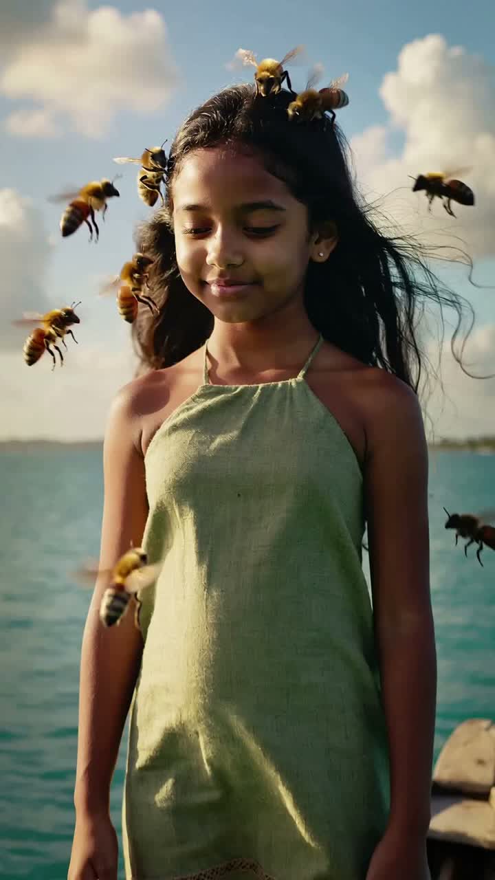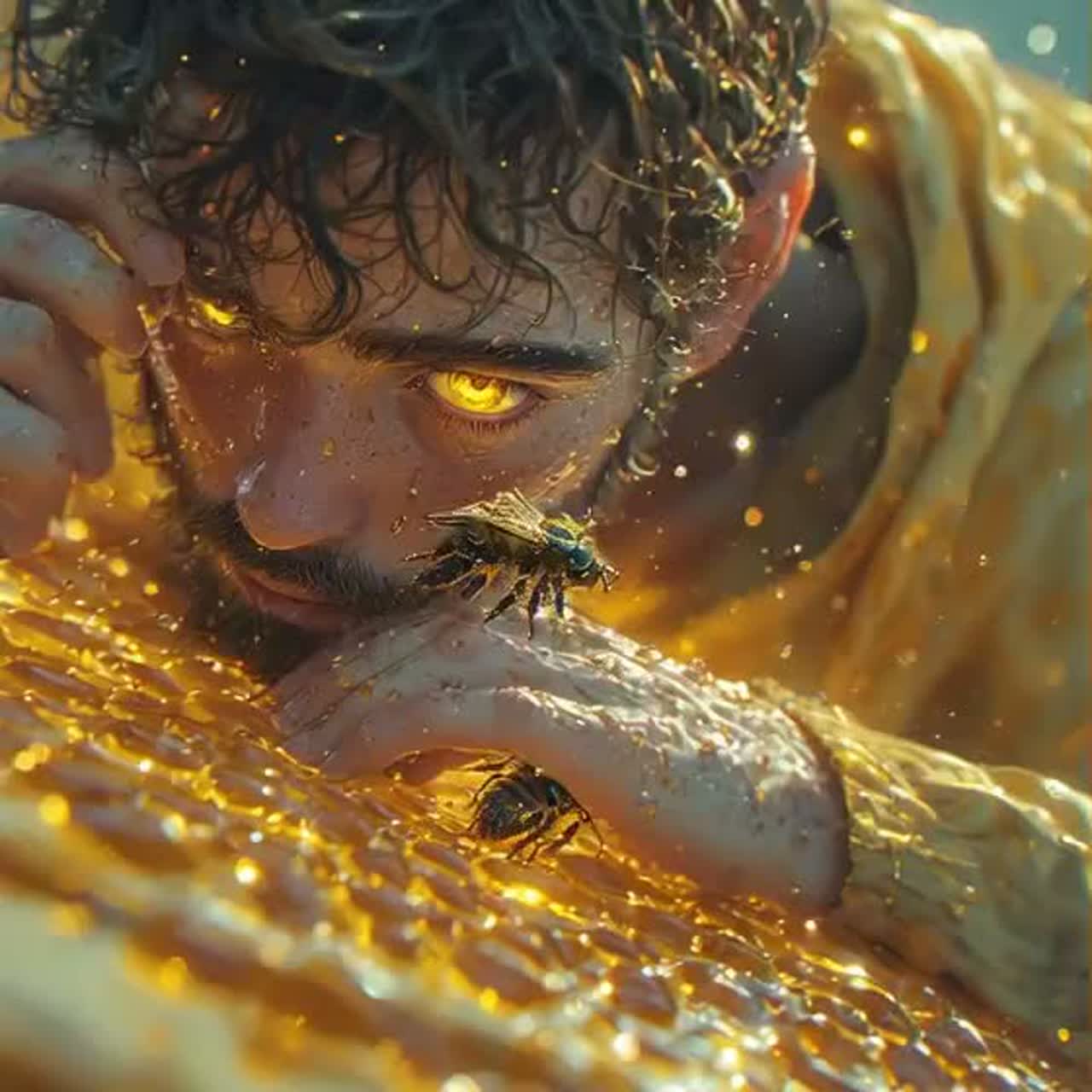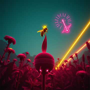 Psychedelic Indietronica, 115 BPM, hypnotic rhythmic pulse, hyper-realistic foley of buzzing wings, shimmering analog synths, intricate layers of organic textures, Scent of warm honey and wildflowers, immersive soundscape, ethereal vocal layers, spatial audio depth