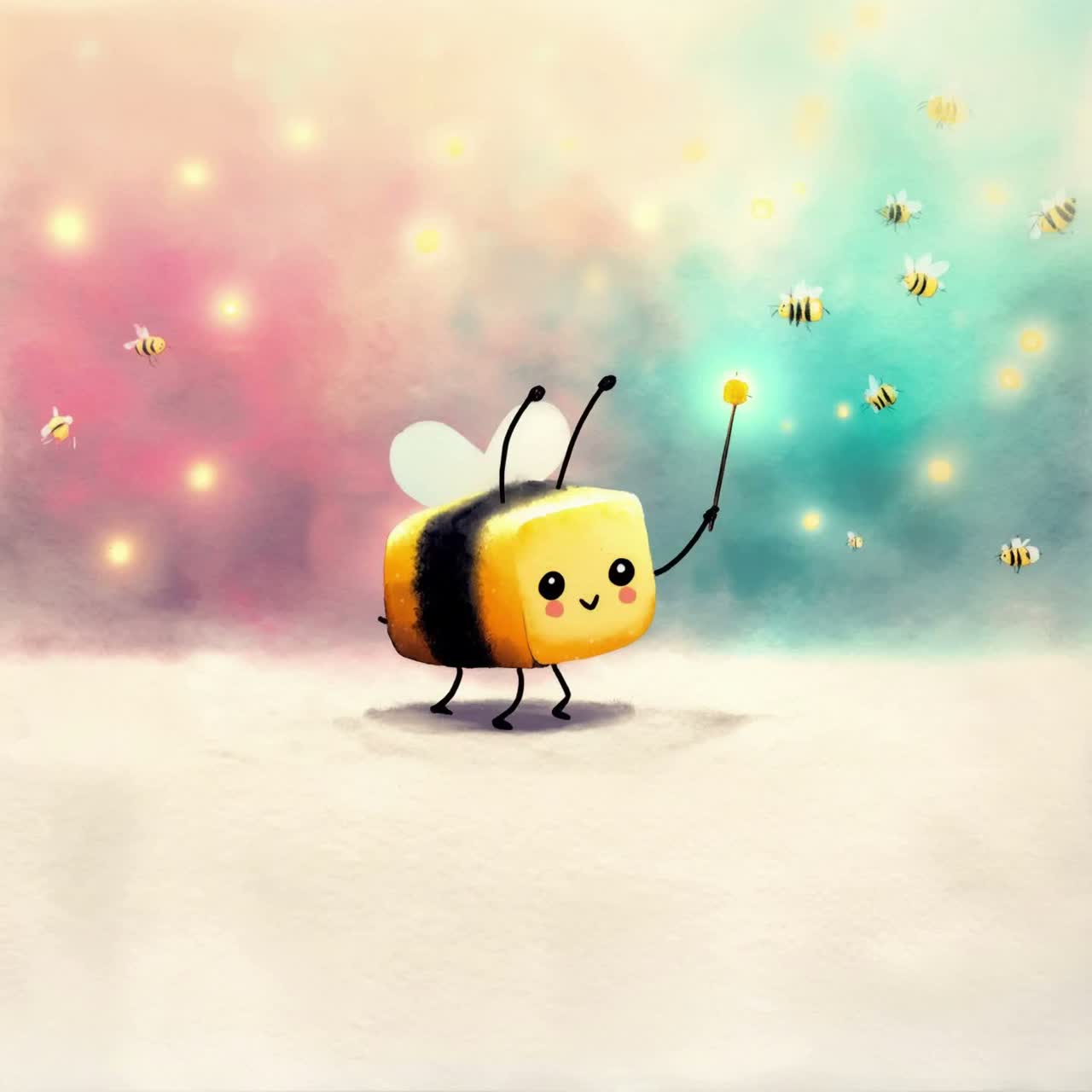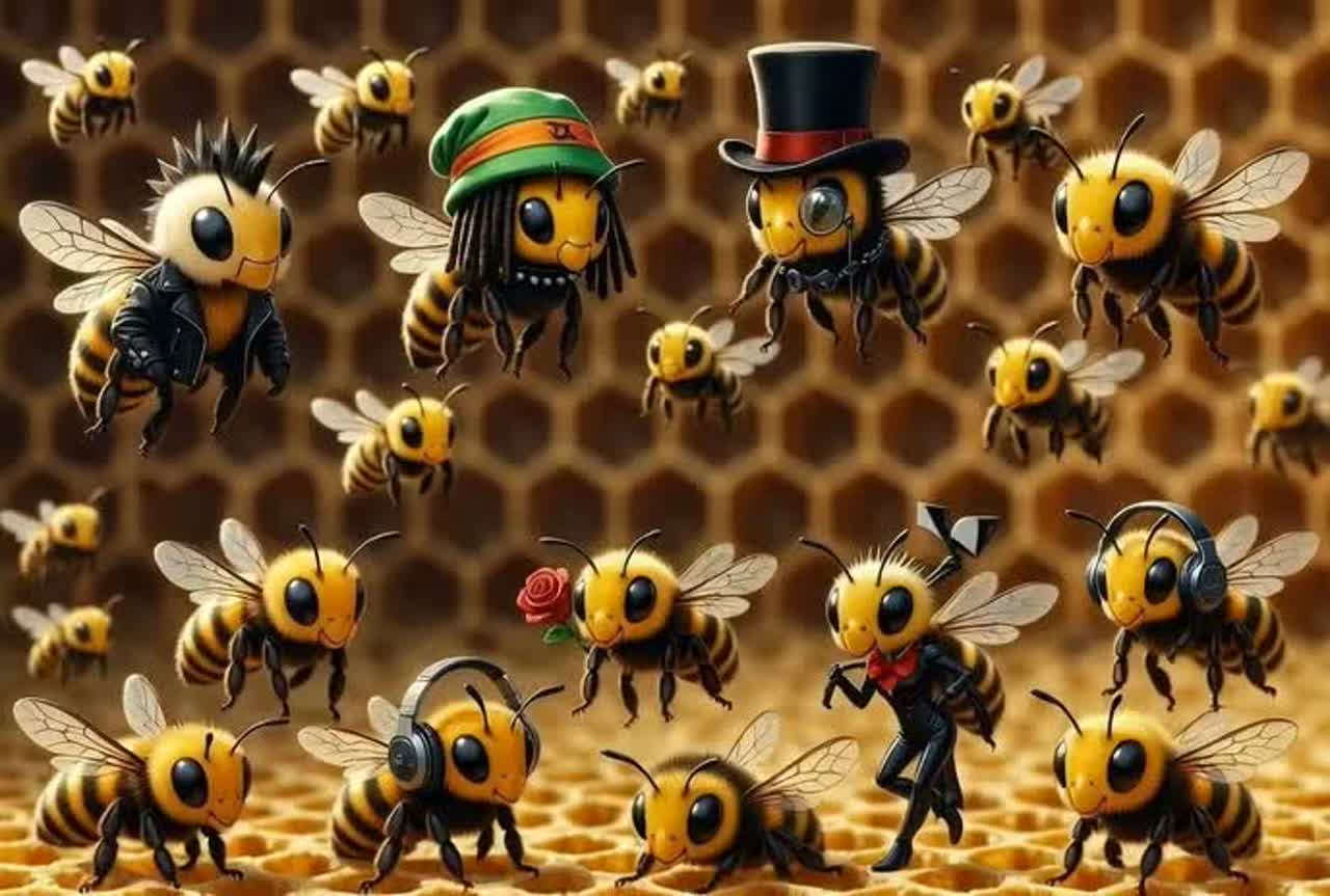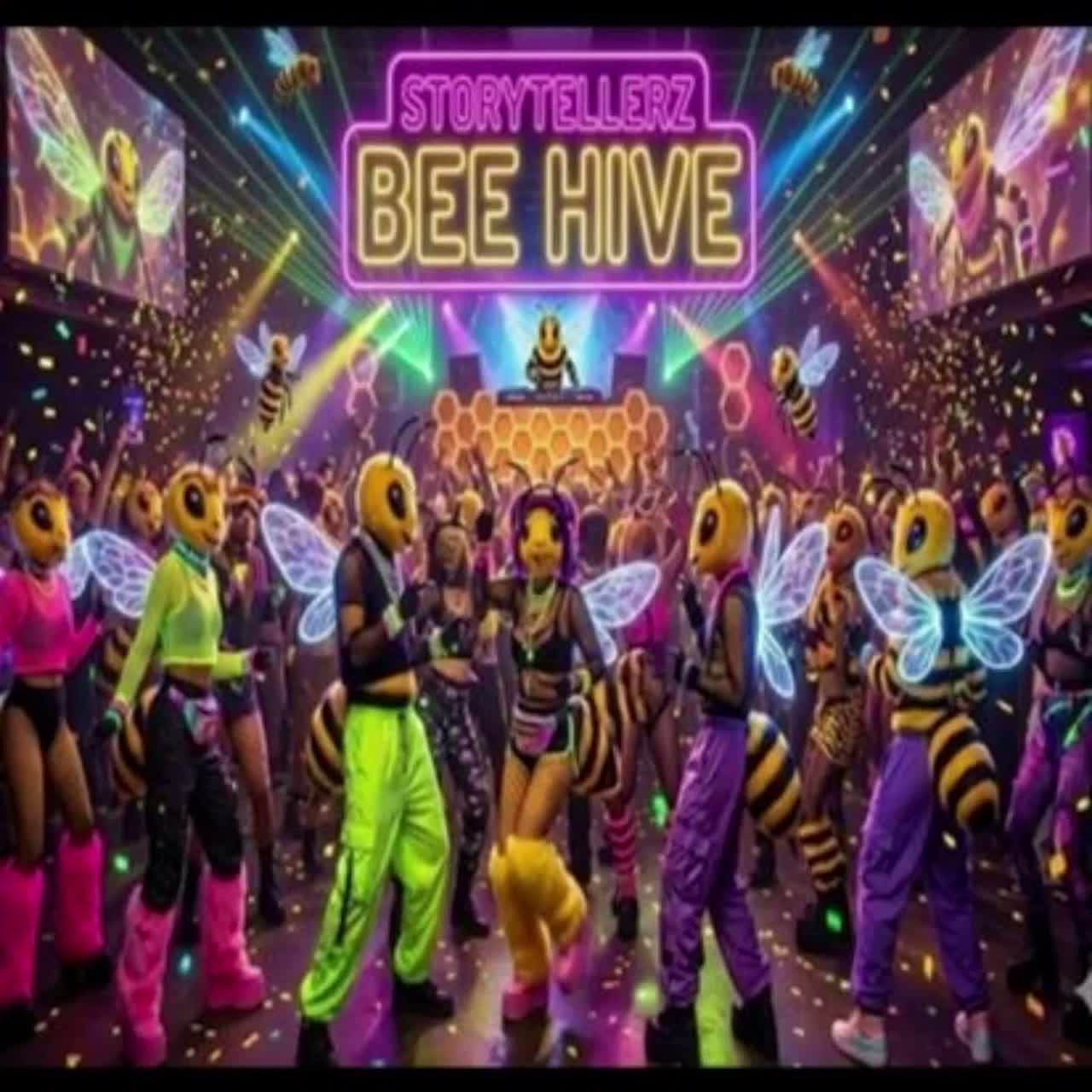 upbeat fun rap party track about creative bee community, buzzing playful bee sound effects and vocal chops, bouncy hip-hop groove with funky bassline and handclaps, cheerful group vocals chanting bee hooks, energetic fun atmosphere celebrating creative hive-mind collaboration, modern party rap with humorous bee metaphors and infectious call-response energy
